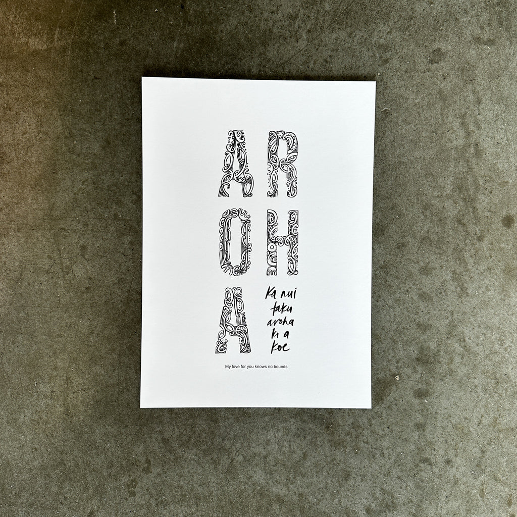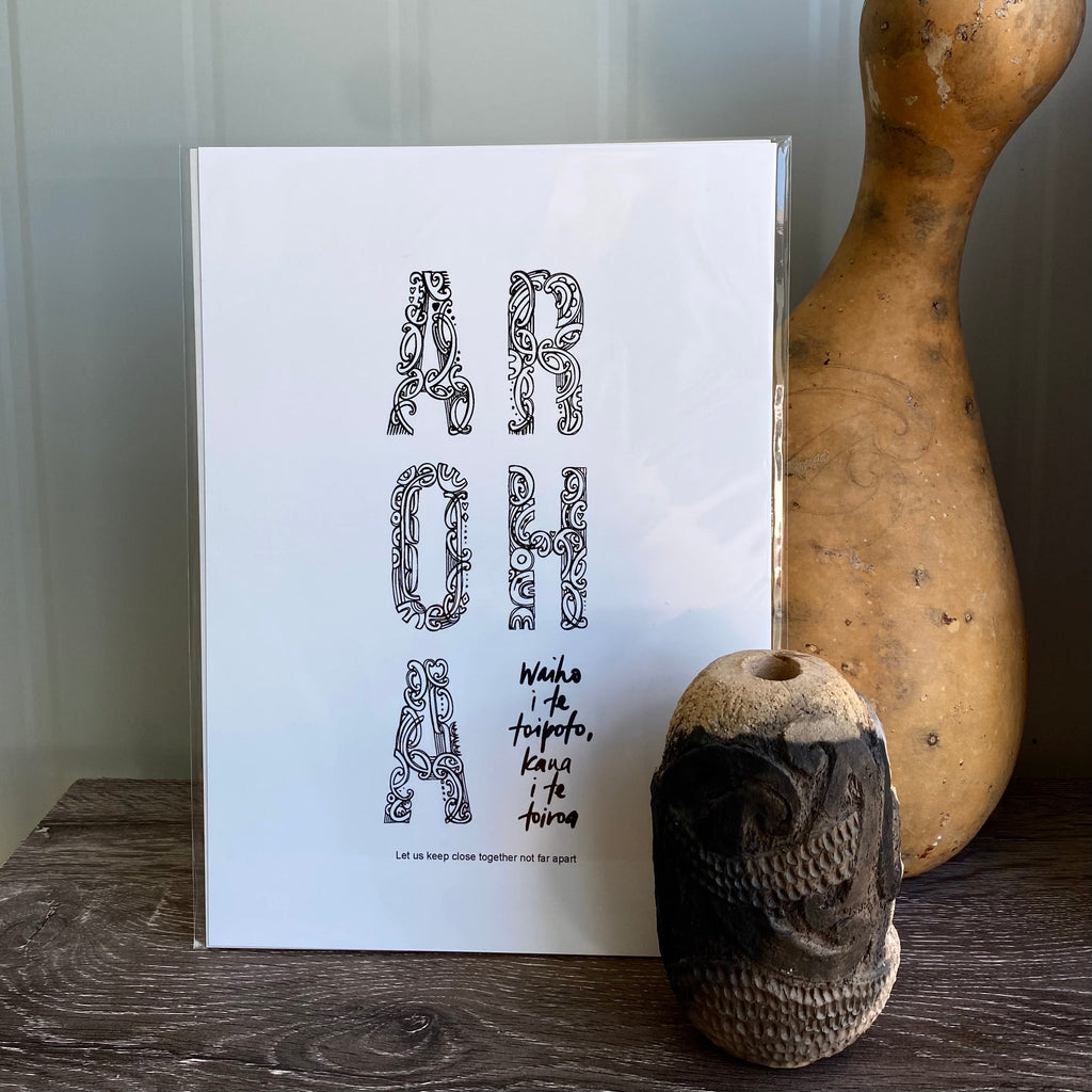 Each print depicts our version of AROHA; we have three prints to choose from, each with a special Whakatauki (proverb) on them.