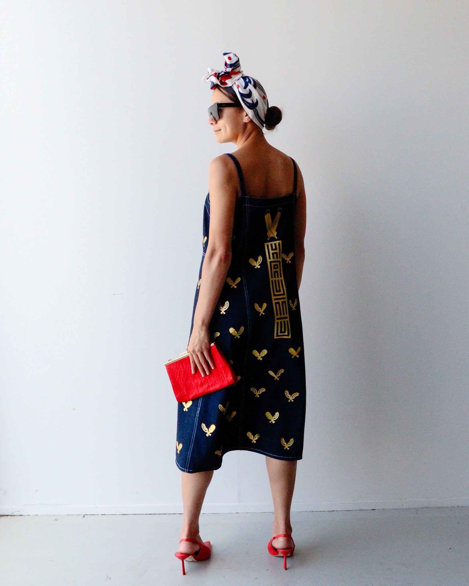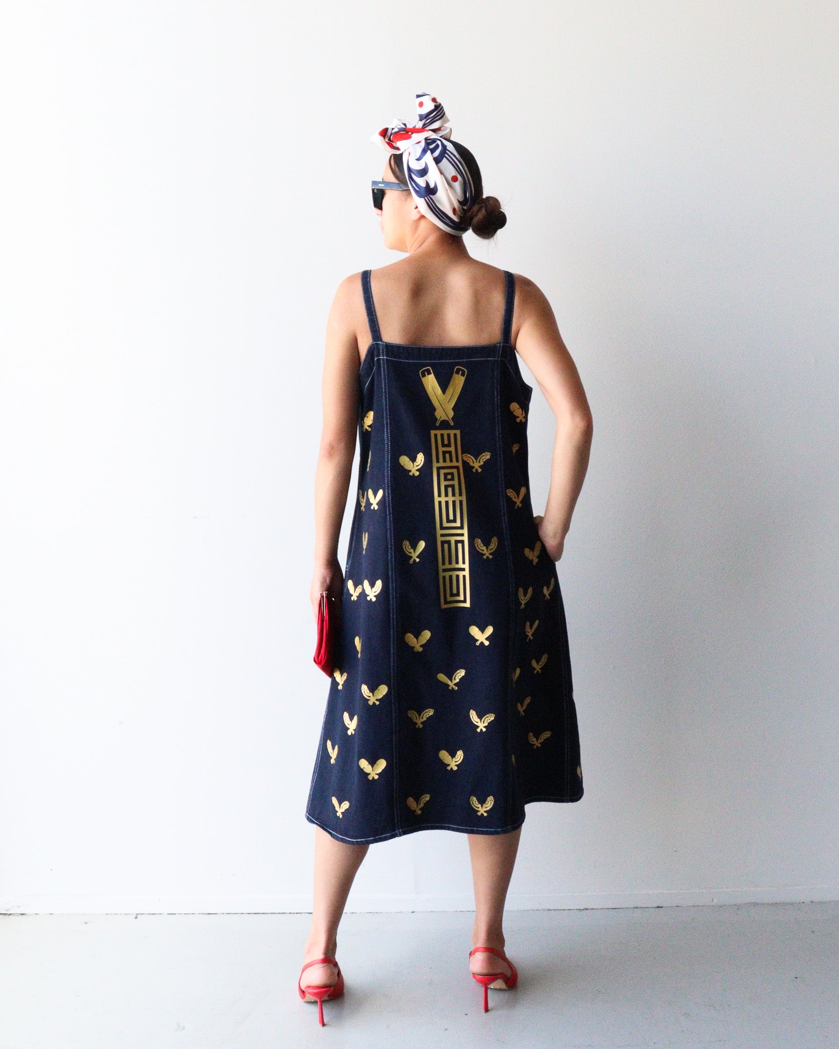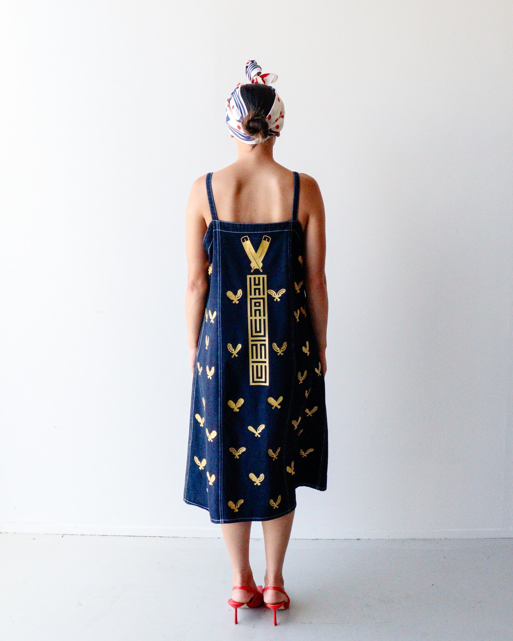 One-of-a-kind, second hand denim dress reimagined through a Māori lens and urban flair. Each piece is hand-printed and painted, telling its own indigenous narrative, no two are the same.