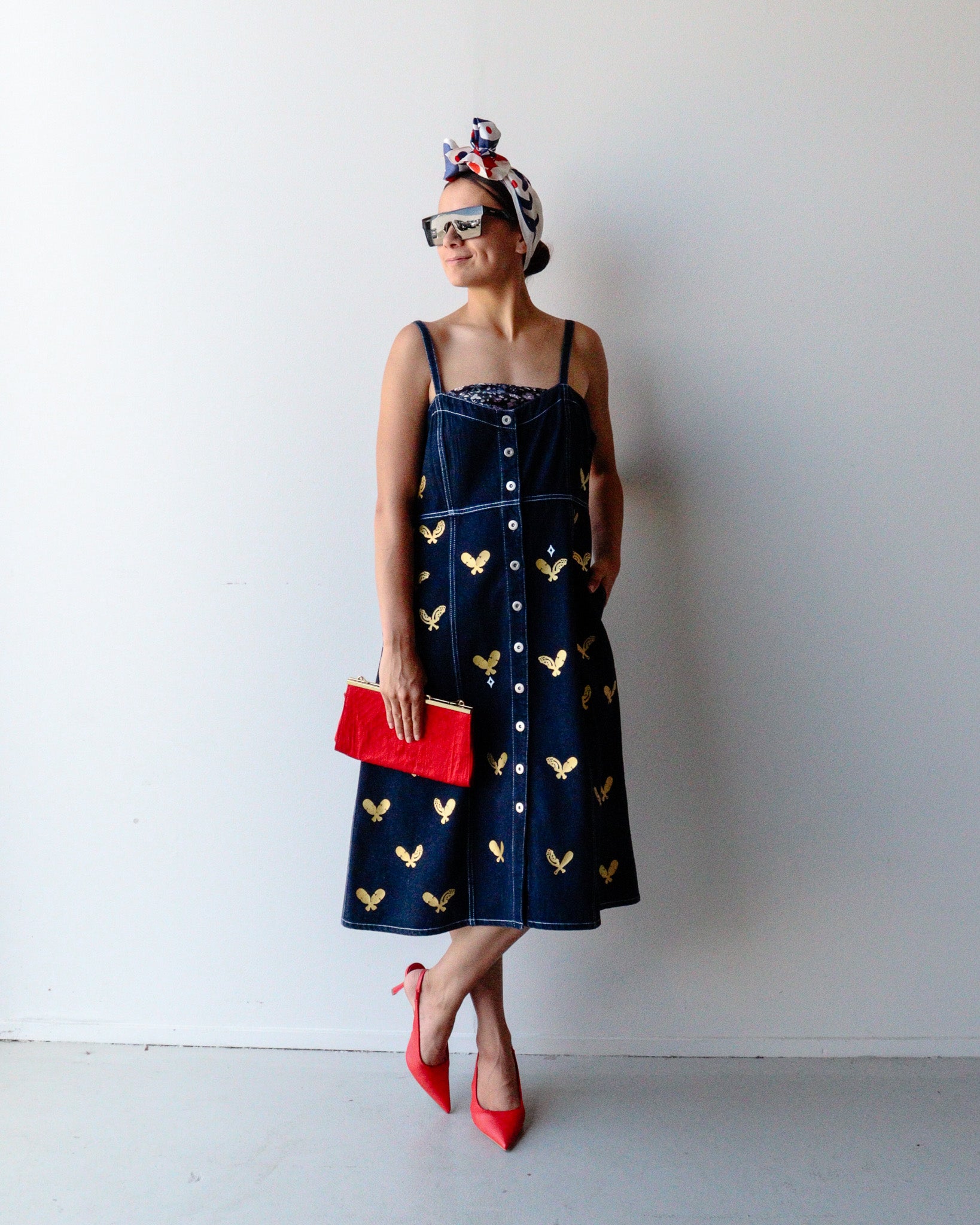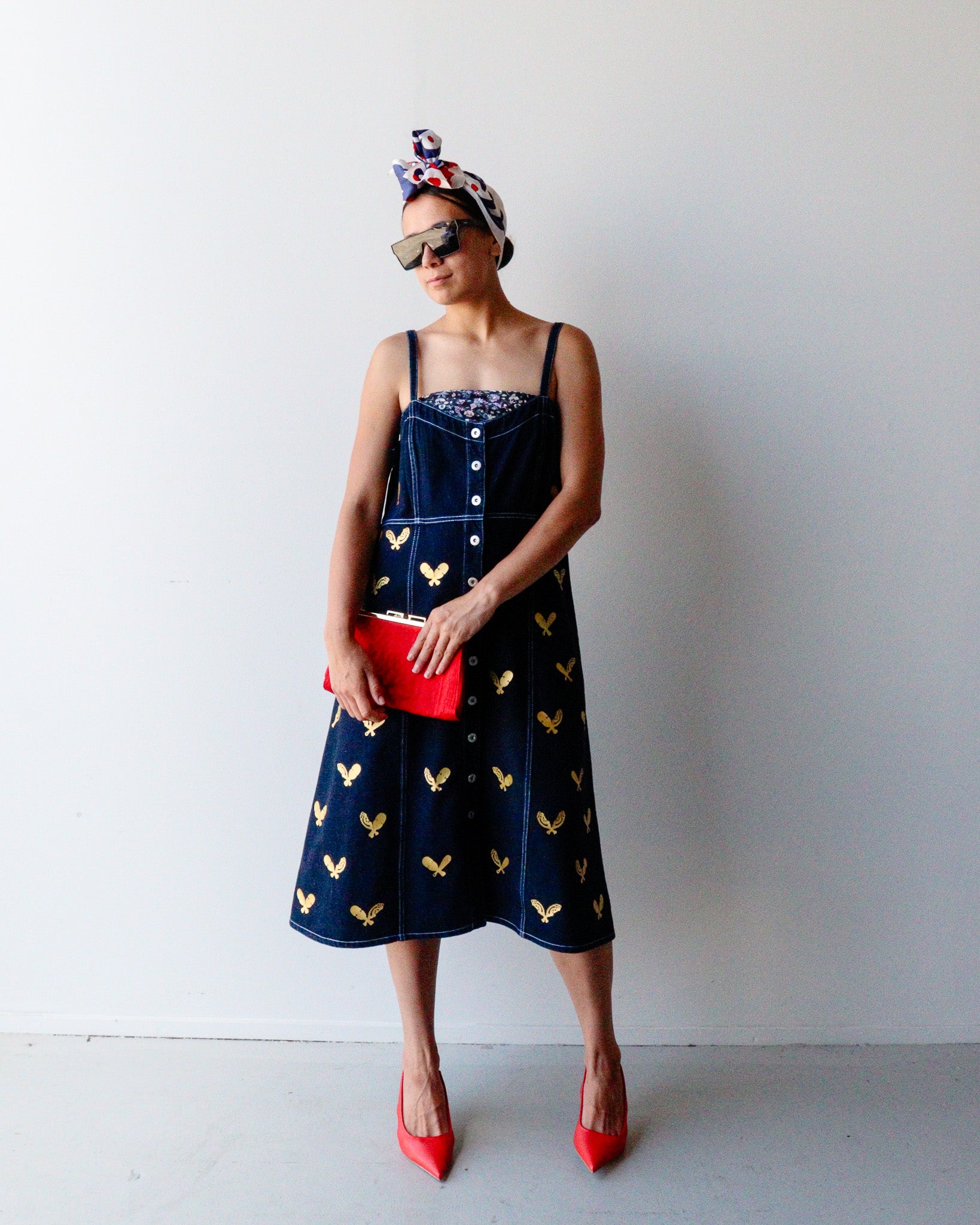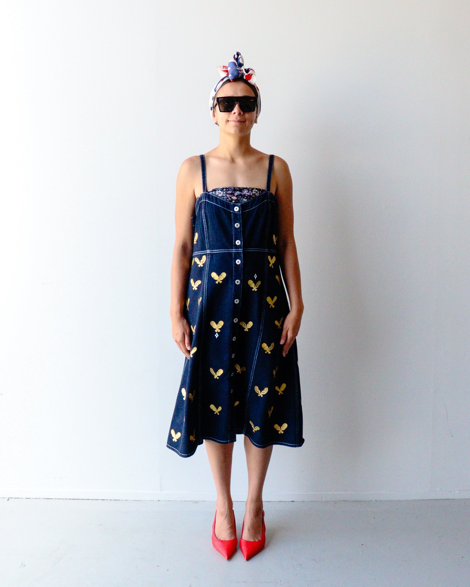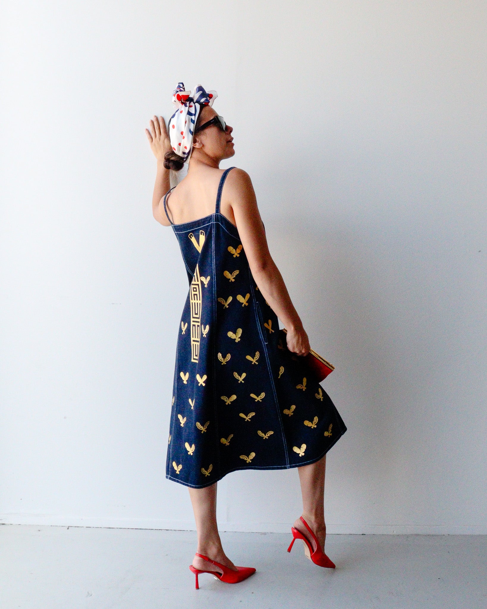 One-of-a-kind, second hand denim dress reimagined through a Māori lens and urban flair. Each piece is hand-printed and painted, telling its own indigenous narrative, no two are the same.