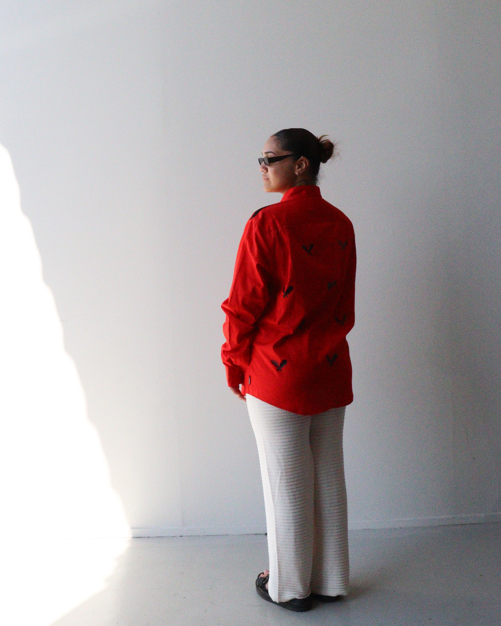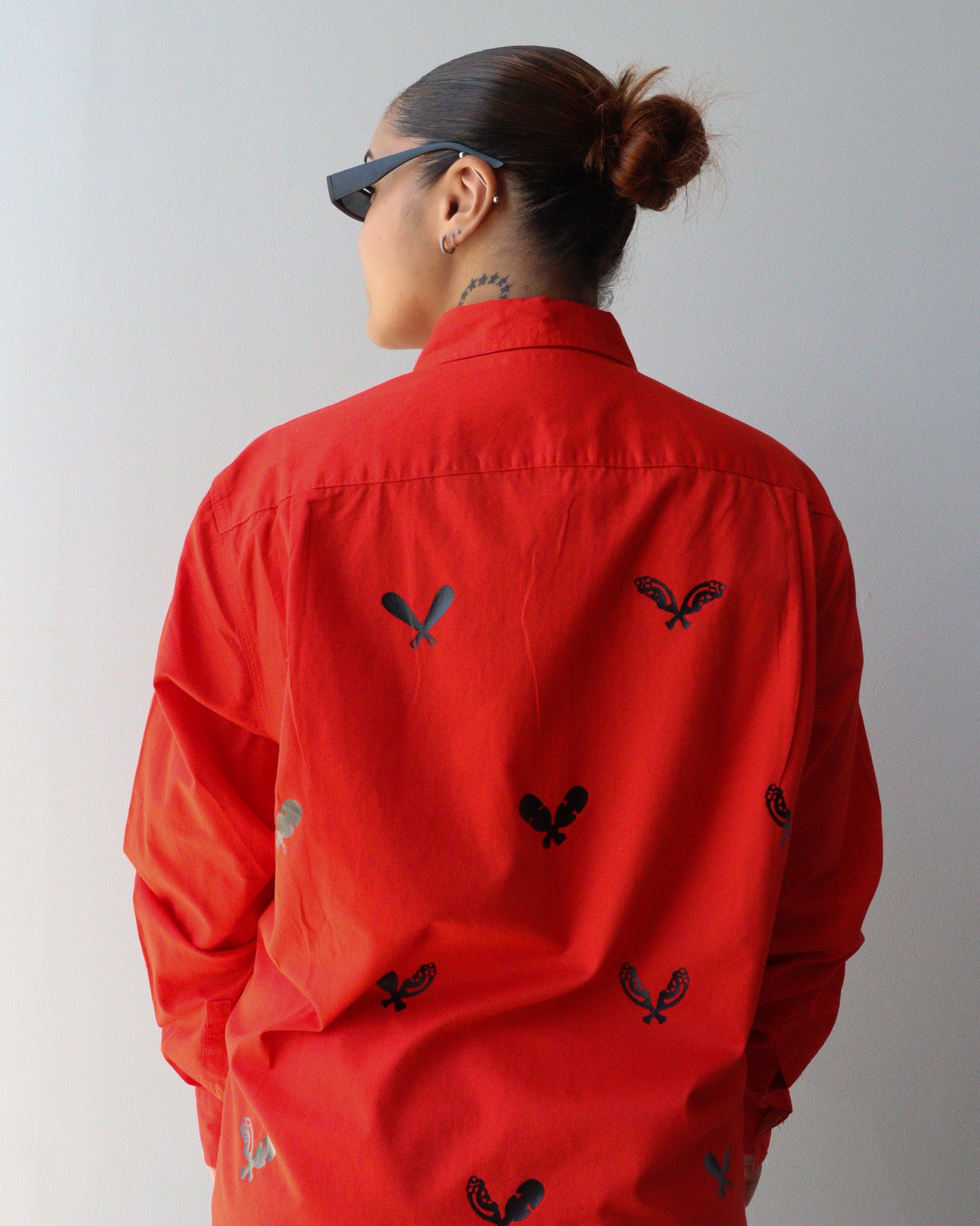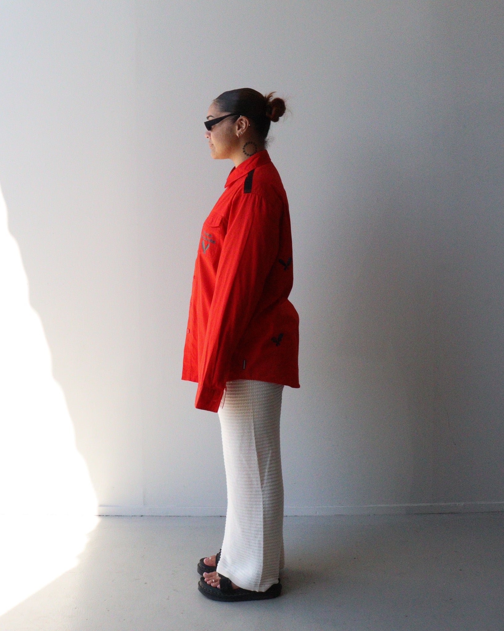 One-of-a-kind, second hand Shirt reimagined through a Māori lens and urban flair. Each piece is hand-printed and painted, telling its own indigenous narrative, no two are the same.