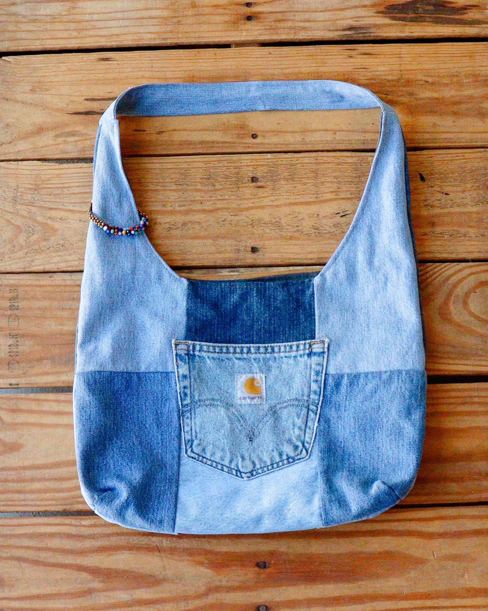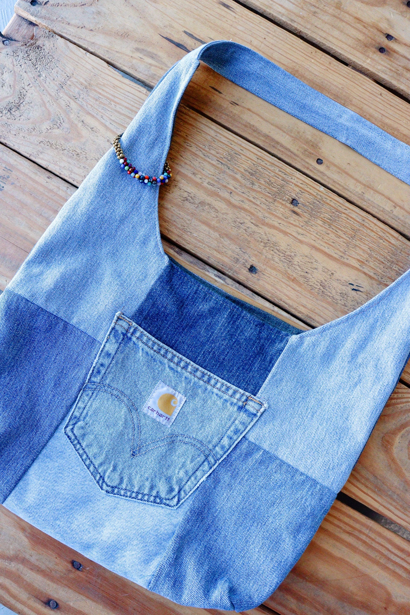 Bag details: This second hand bag is not made by us, it includes a pocket on the inside and is up cycled from denim fabric.