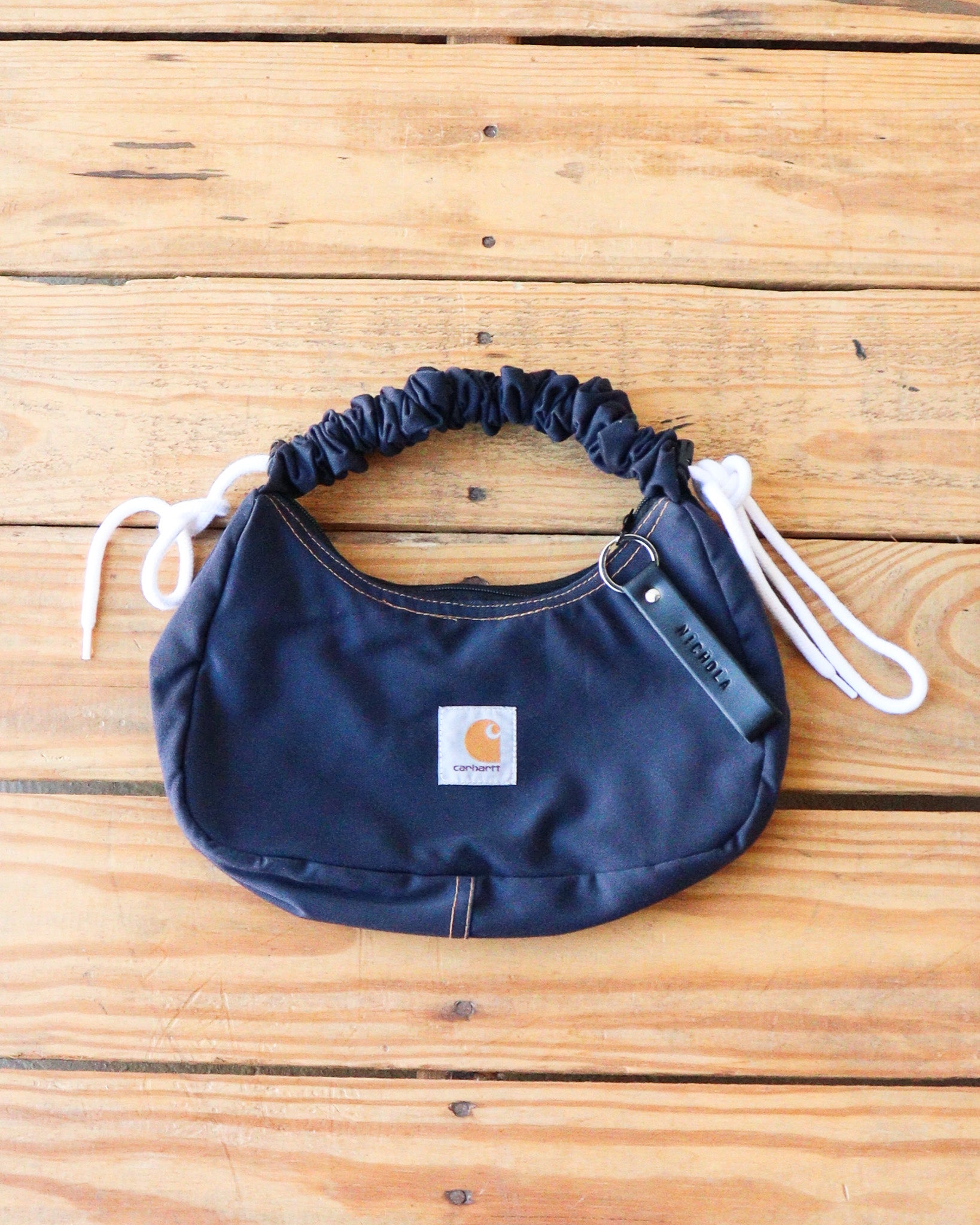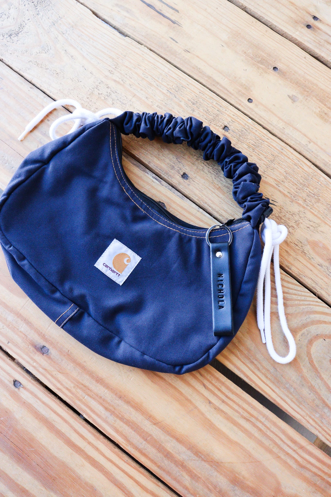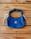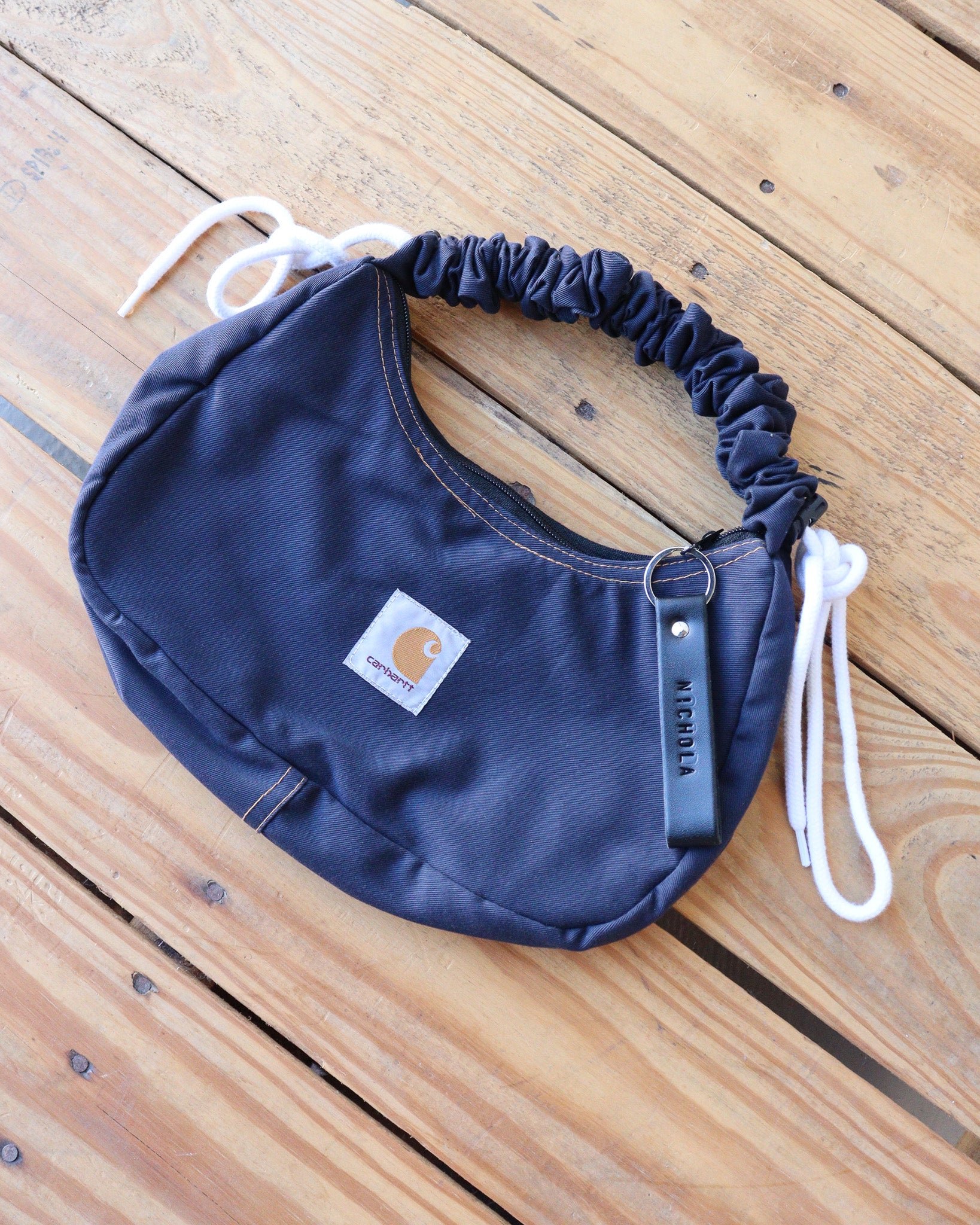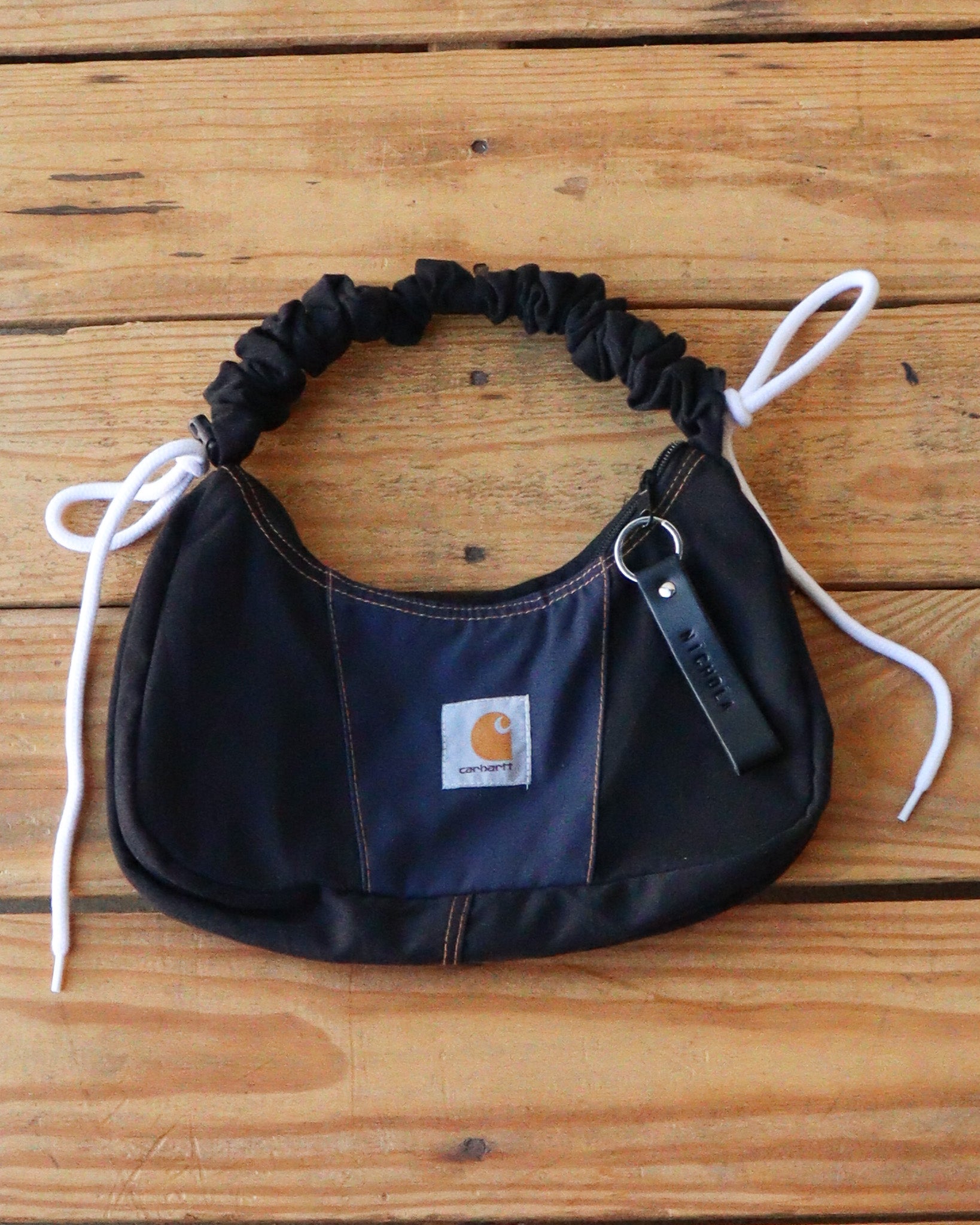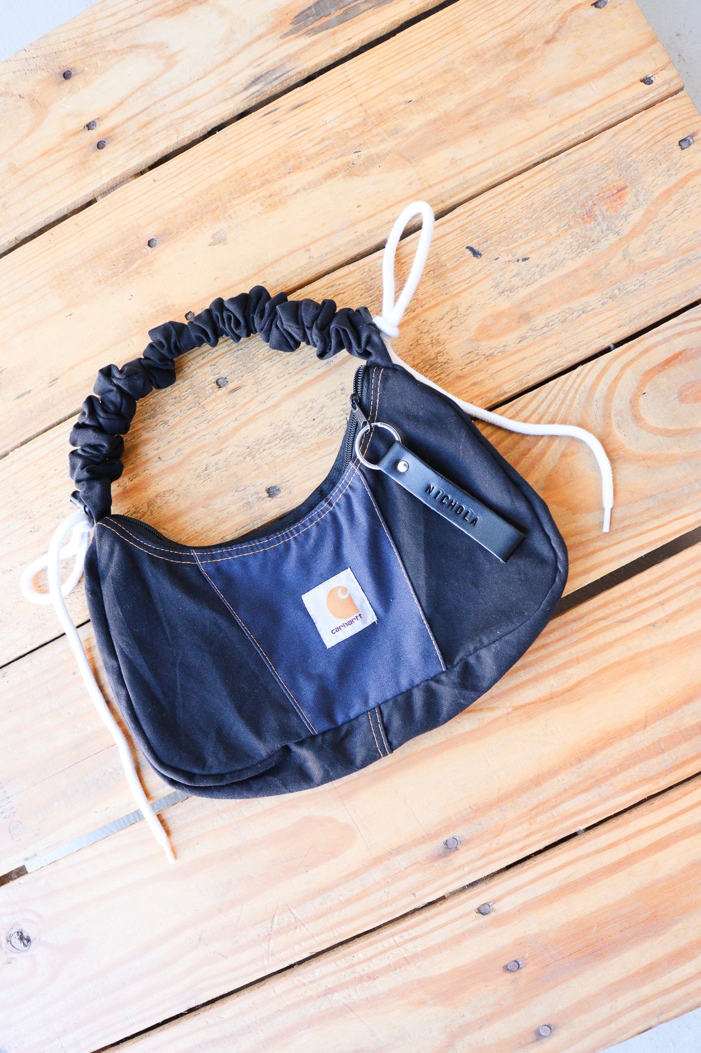 A compact statement piece with a clever twist, this upcycled Carhartt bag is designed to be worn your way... as a handbag or a short shoulder bag. The soft ruched strap features adjustable ties, letting you extend or tighten the handle to suit the moment. Made from reclaimed workwear fabric, it’s durable, lightweight, and perfectly sized for your daily essentials. Finished with contrast stitching and a Nichola tag, it brings sustainable style and a touch of attitude to any outfit.