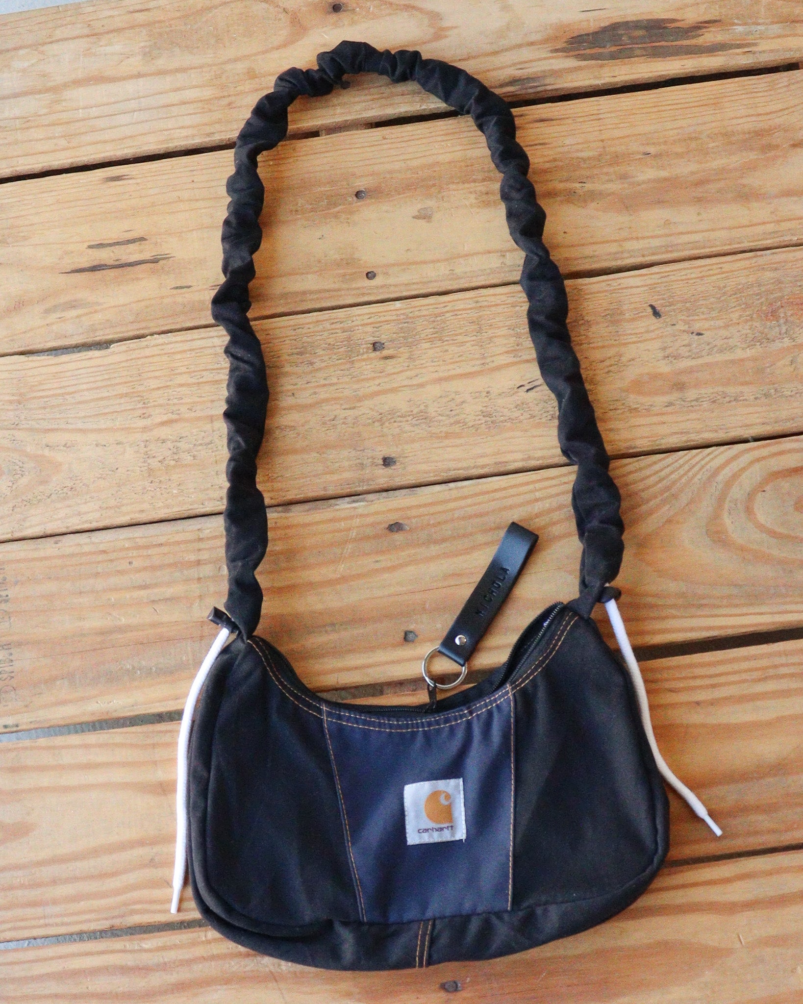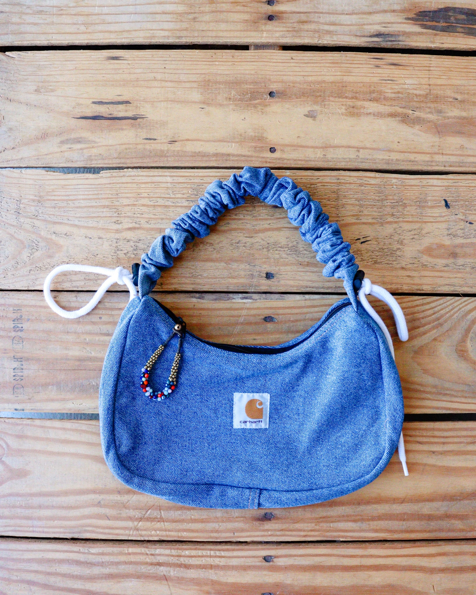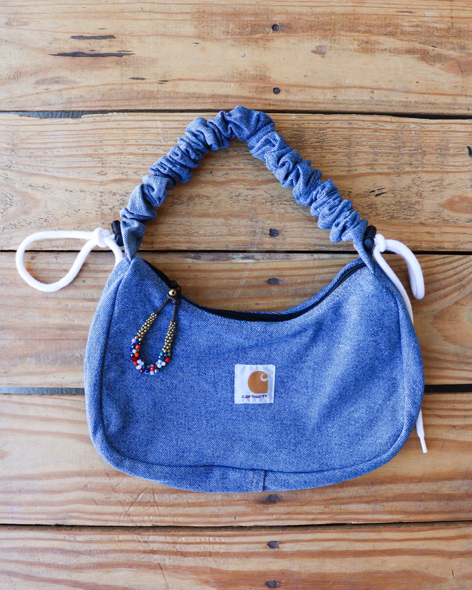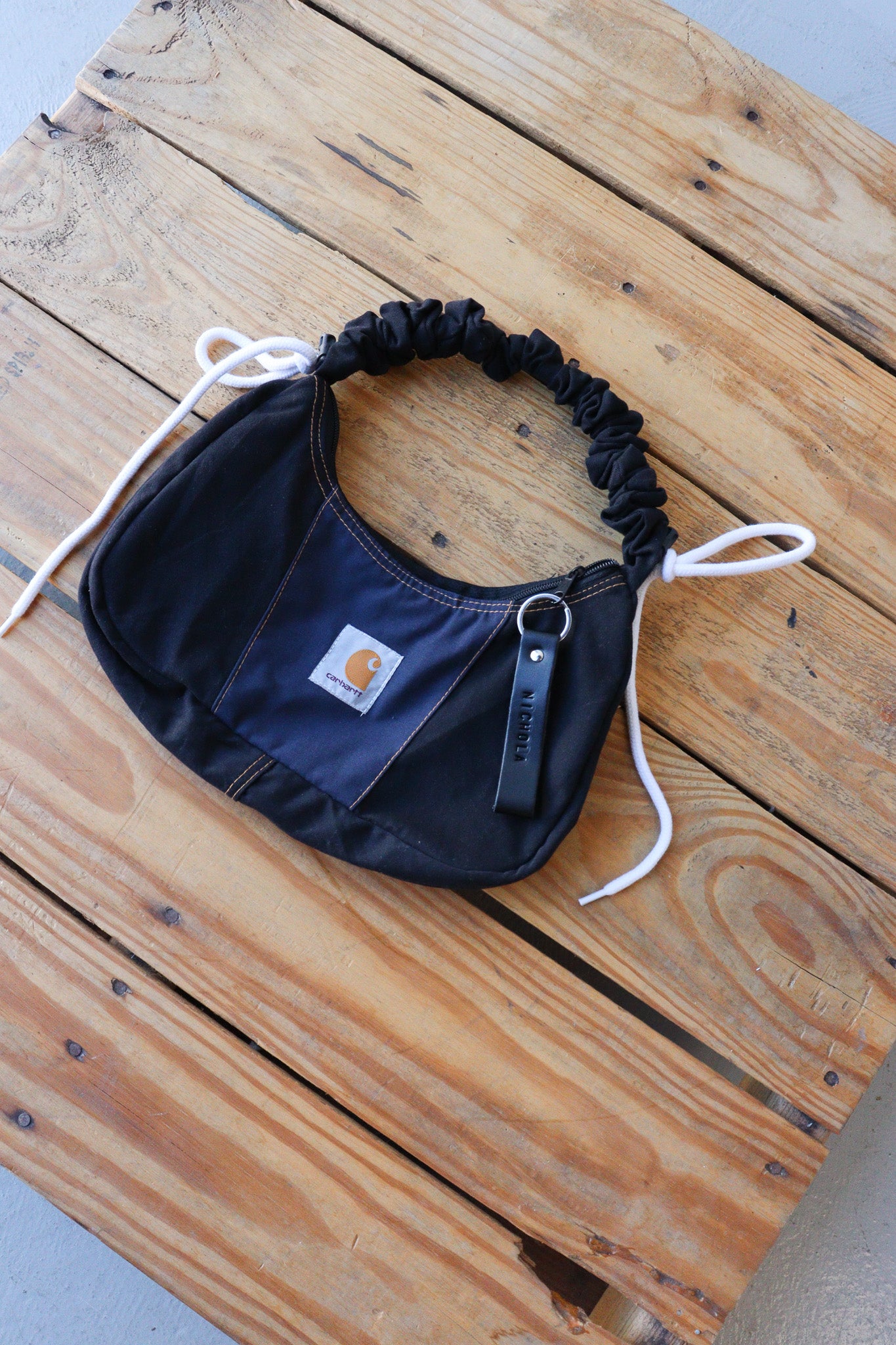 A compact statement piece with a clever twist, this upcycled Carhartt bag is designed to be worn your way... as a handbag or a short shoulder bag. The soft ruched strap features adjustable ties, letting you extend or tighten the handle to suit the moment. Made from reclaimed workwear fabric, it’s durable, lightweight, and perfectly sized for your daily essentials. Finished with contrast stitching and a Nichola tag, it brings sustainable style and a touch of attitude to any outfit.