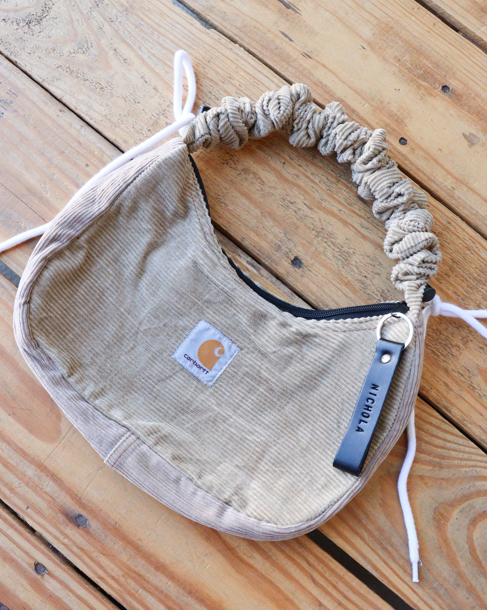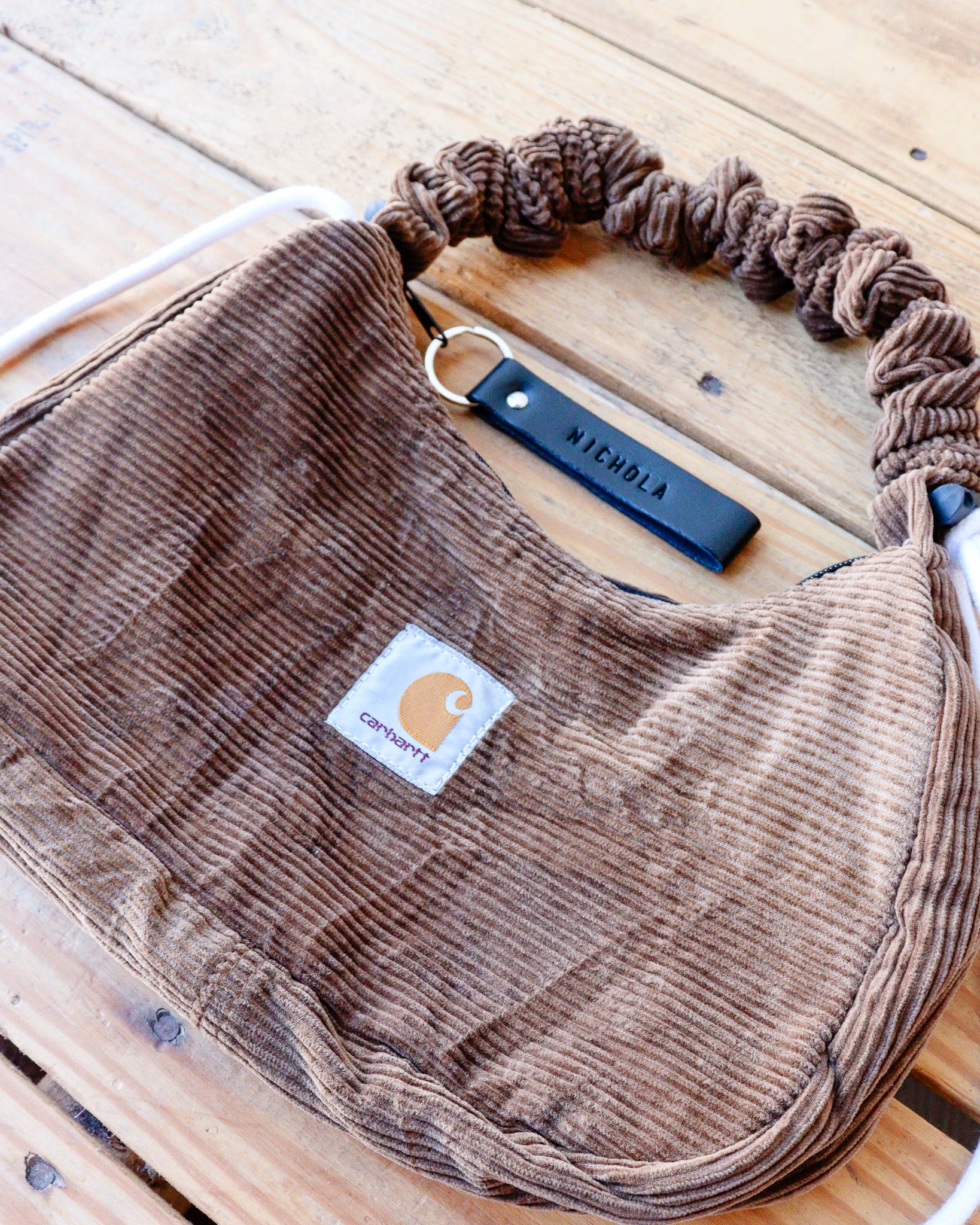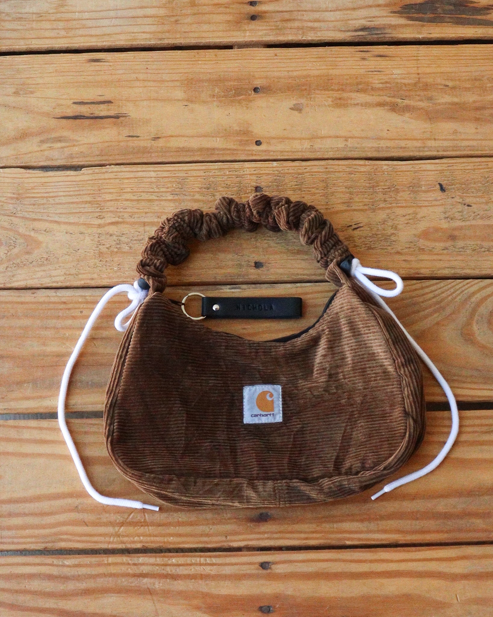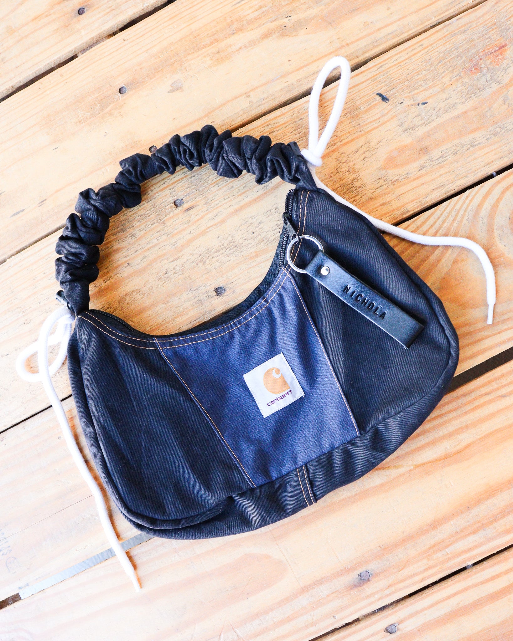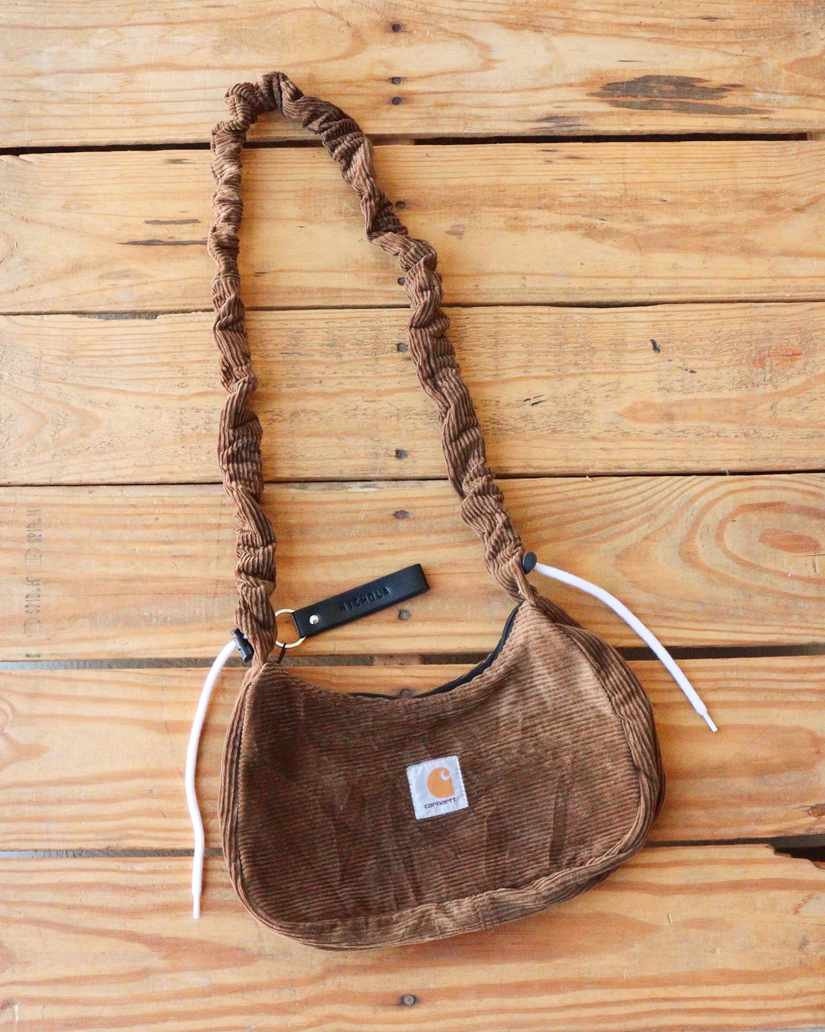 A compact statement piece with a clever twist, this upcycled Carhartt bag is designed to be worn your way... as a handbag or a short shoulder bag. The soft ruched strap features adjustable ties, letting you extend or tighten the handle to suit the moment. Made from reclaimed workwear fabric, it’s durable, lightweight, and perfectly sized for your daily essentials. Finished with contrast stitching and a Nichola tag, it brings sustainable style and a touch of attitude to any outfit.