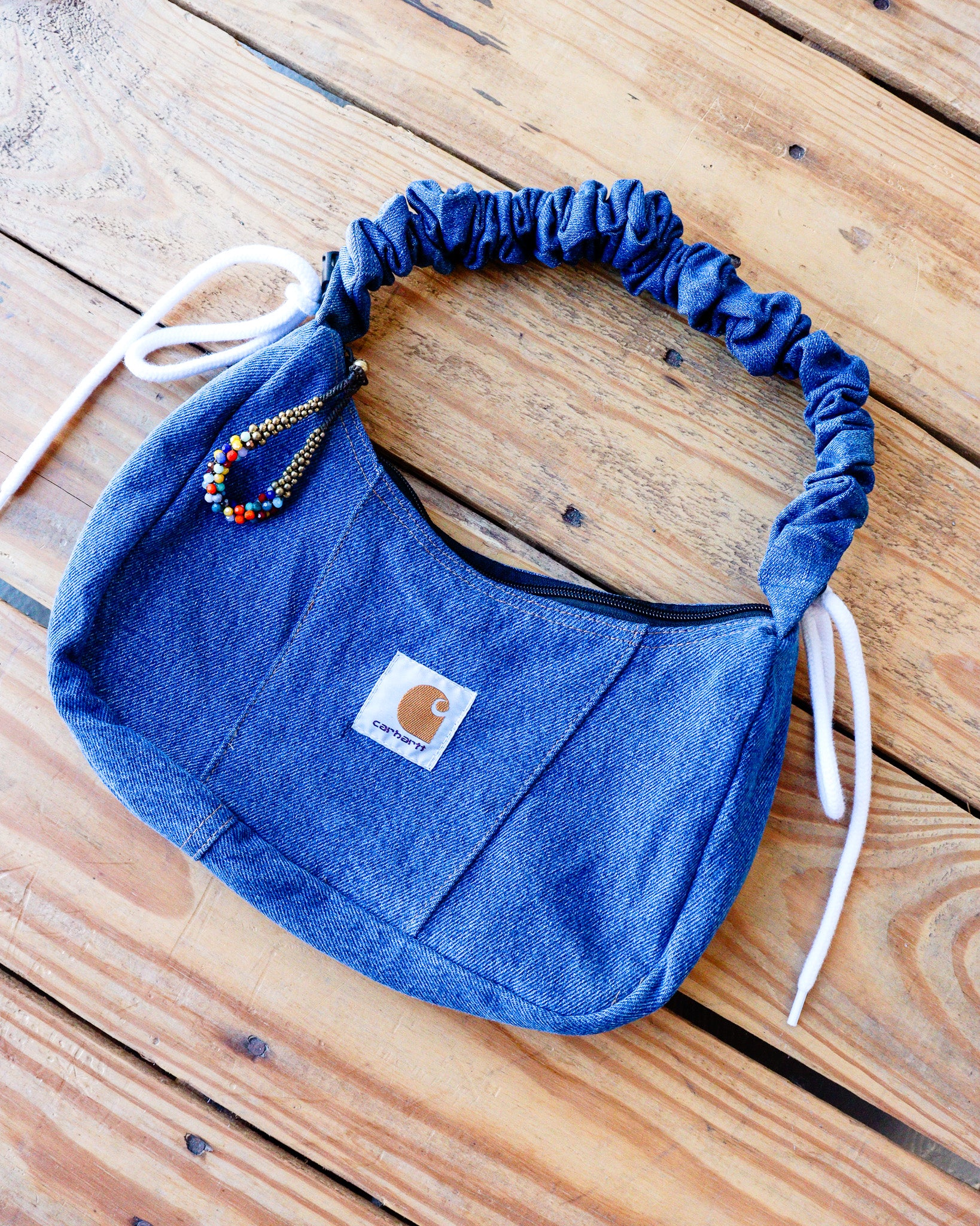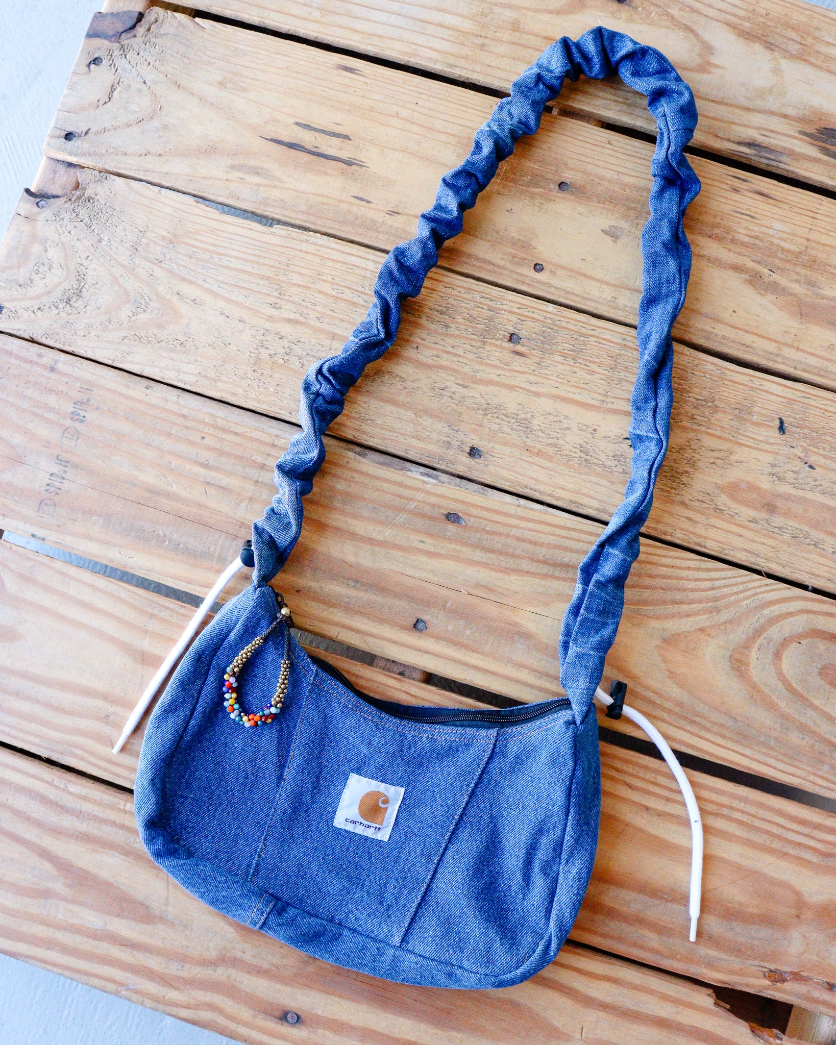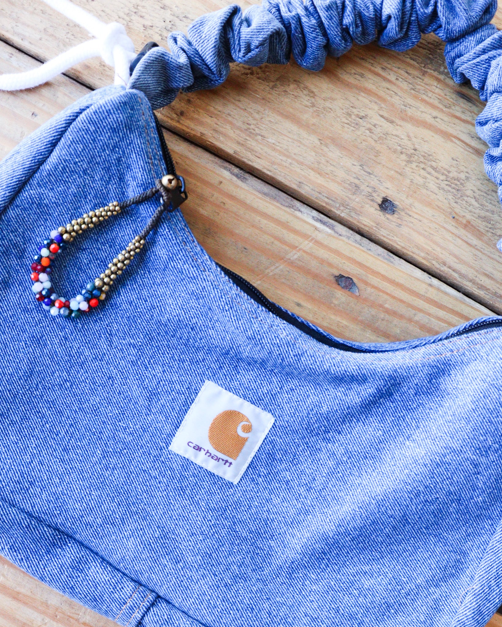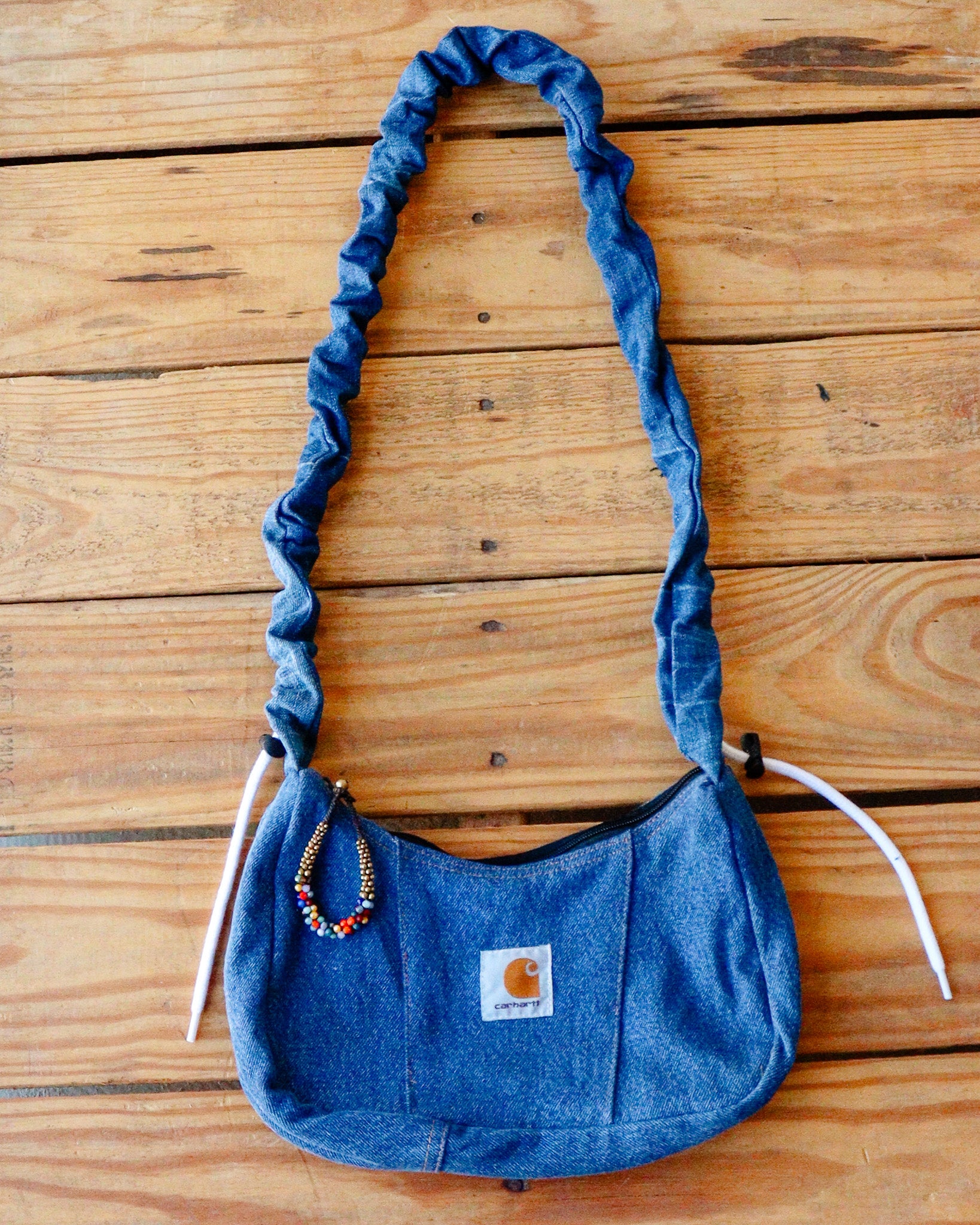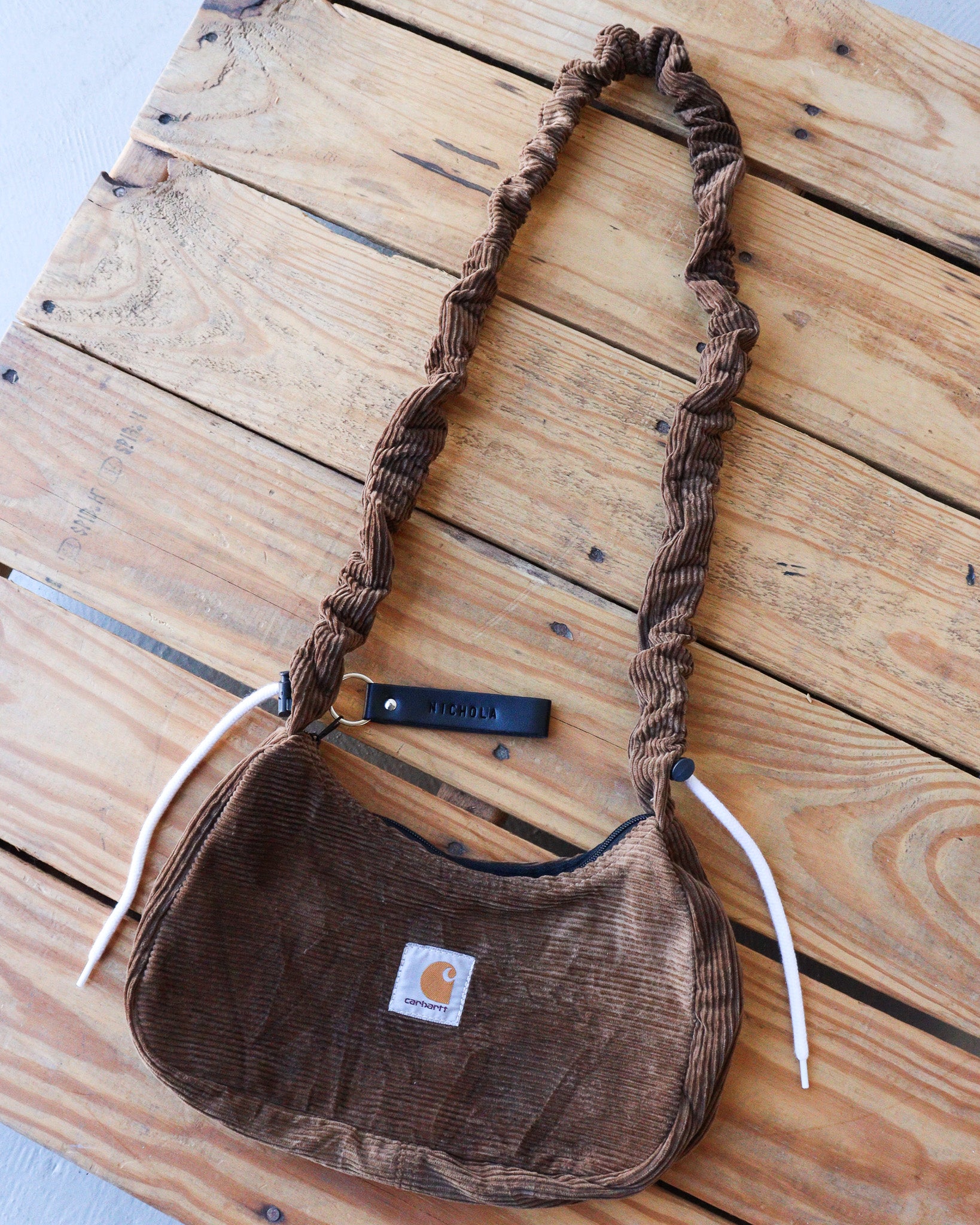 A compact statement piece with a clever twist, this upcycled Carhartt bag is designed to be worn your way... as a handbag or a short shoulder bag. The soft ruched strap features adjustable ties, letting you extend or tighten the handle to suit the moment. Made from reclaimed workwear fabric, it’s durable, lightweight, and perfectly sized for your daily essentials. Finished with contrast stitching and a Nichola tag, it brings sustainable style and a touch of attitude to any outfit.