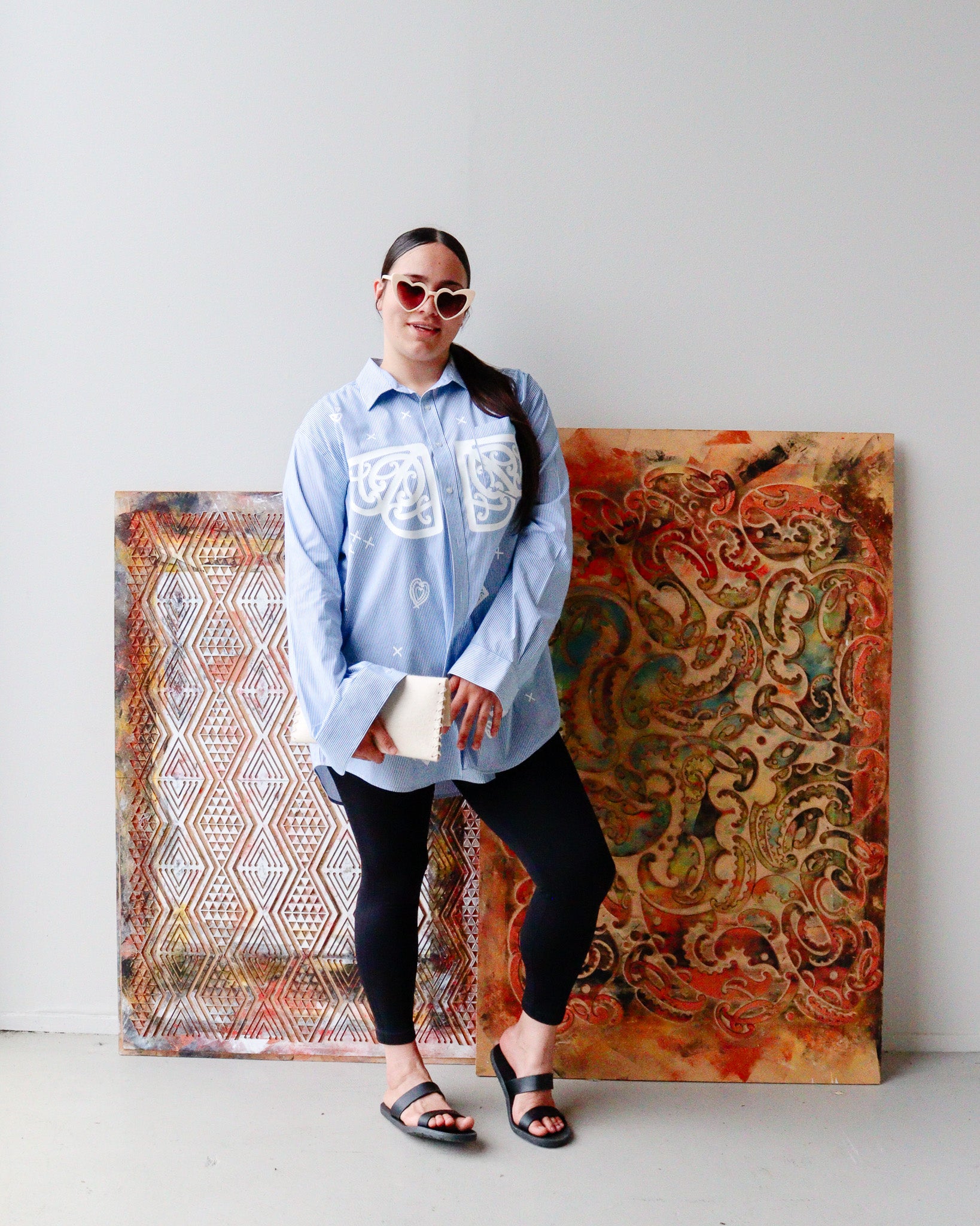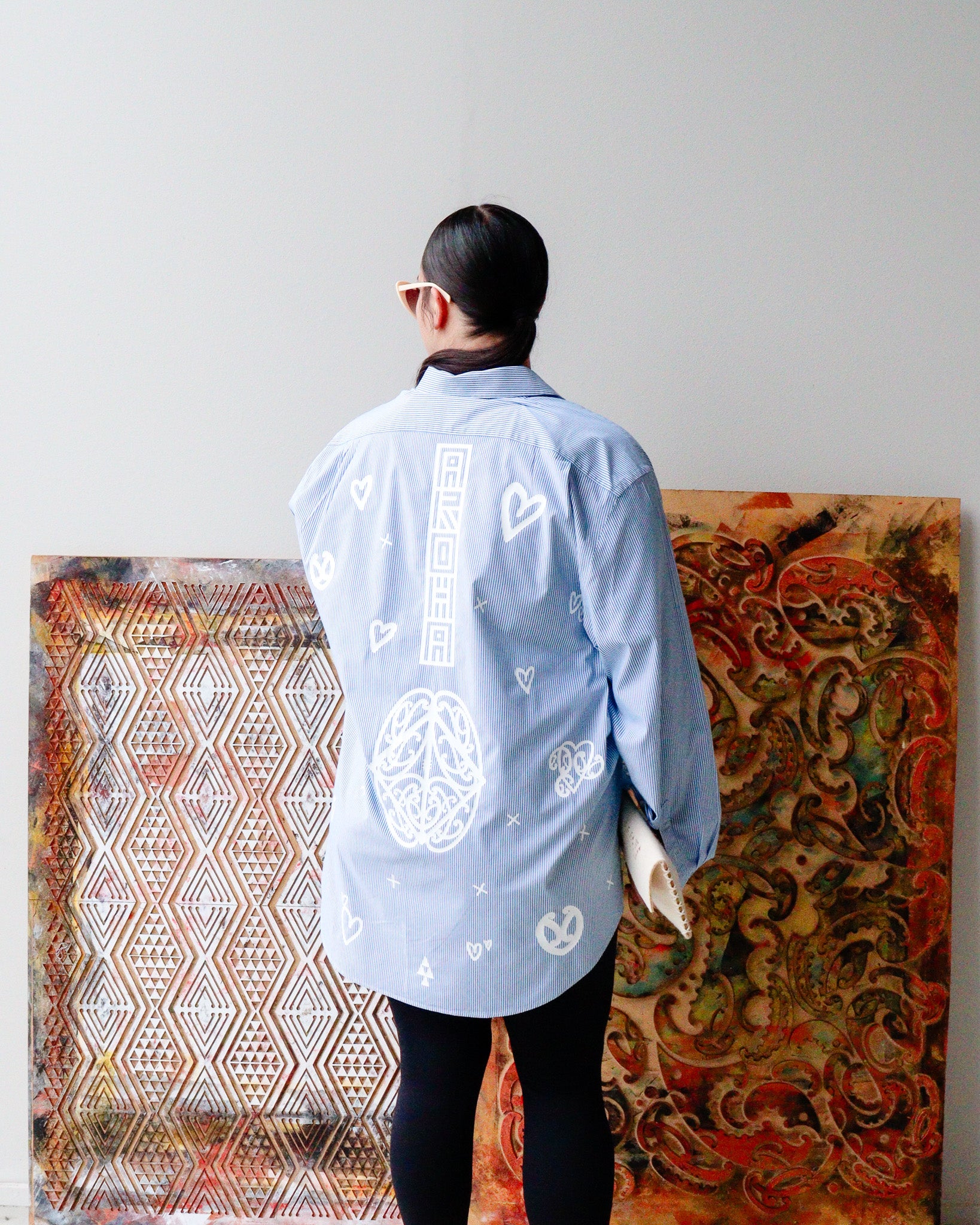 One-of-a-kind, second hand long sleeve shirt reimagined through a Māori lens and urban flair. Each piece is hand-printed and painted, telling its own indigenous narrative, no two are the same.