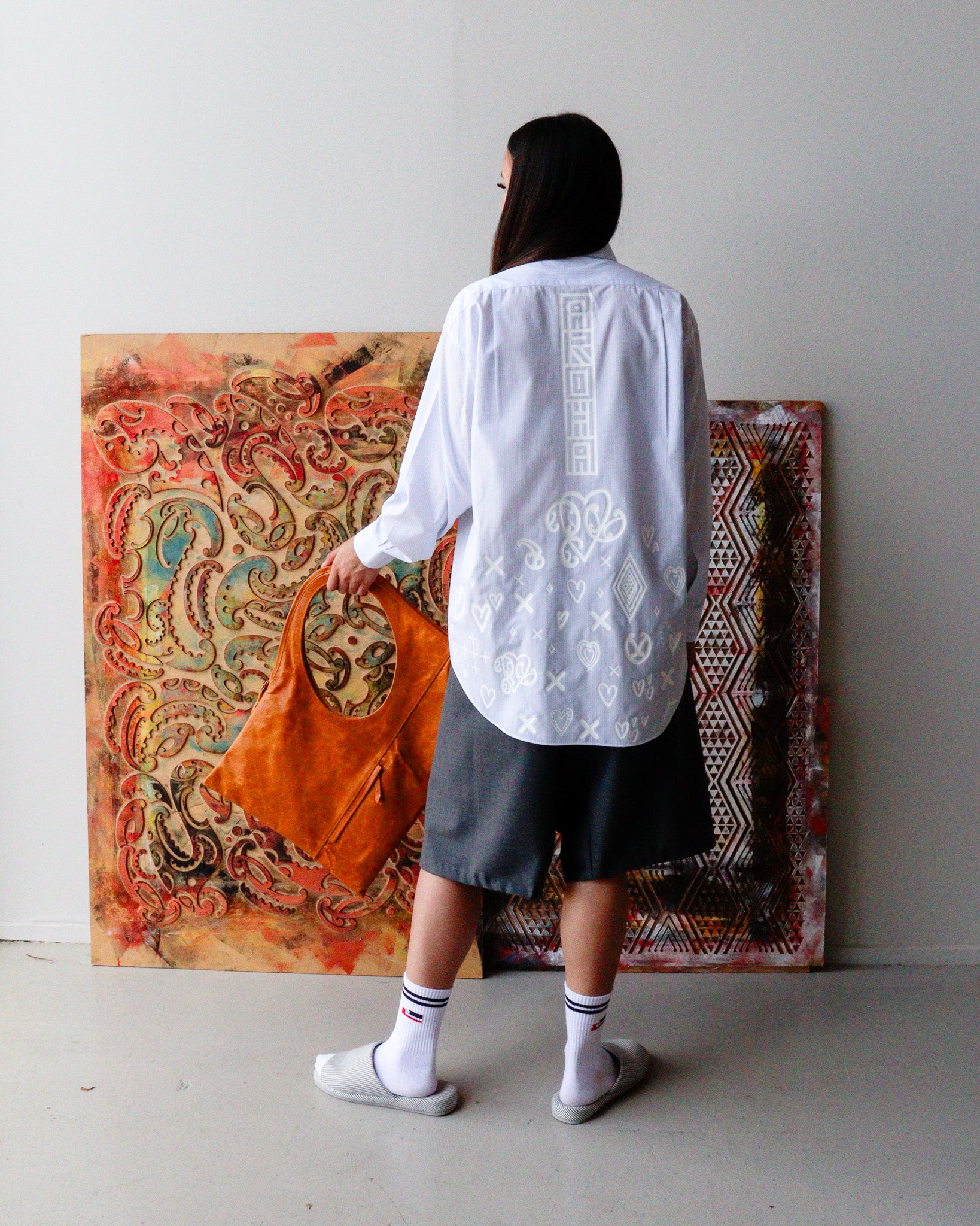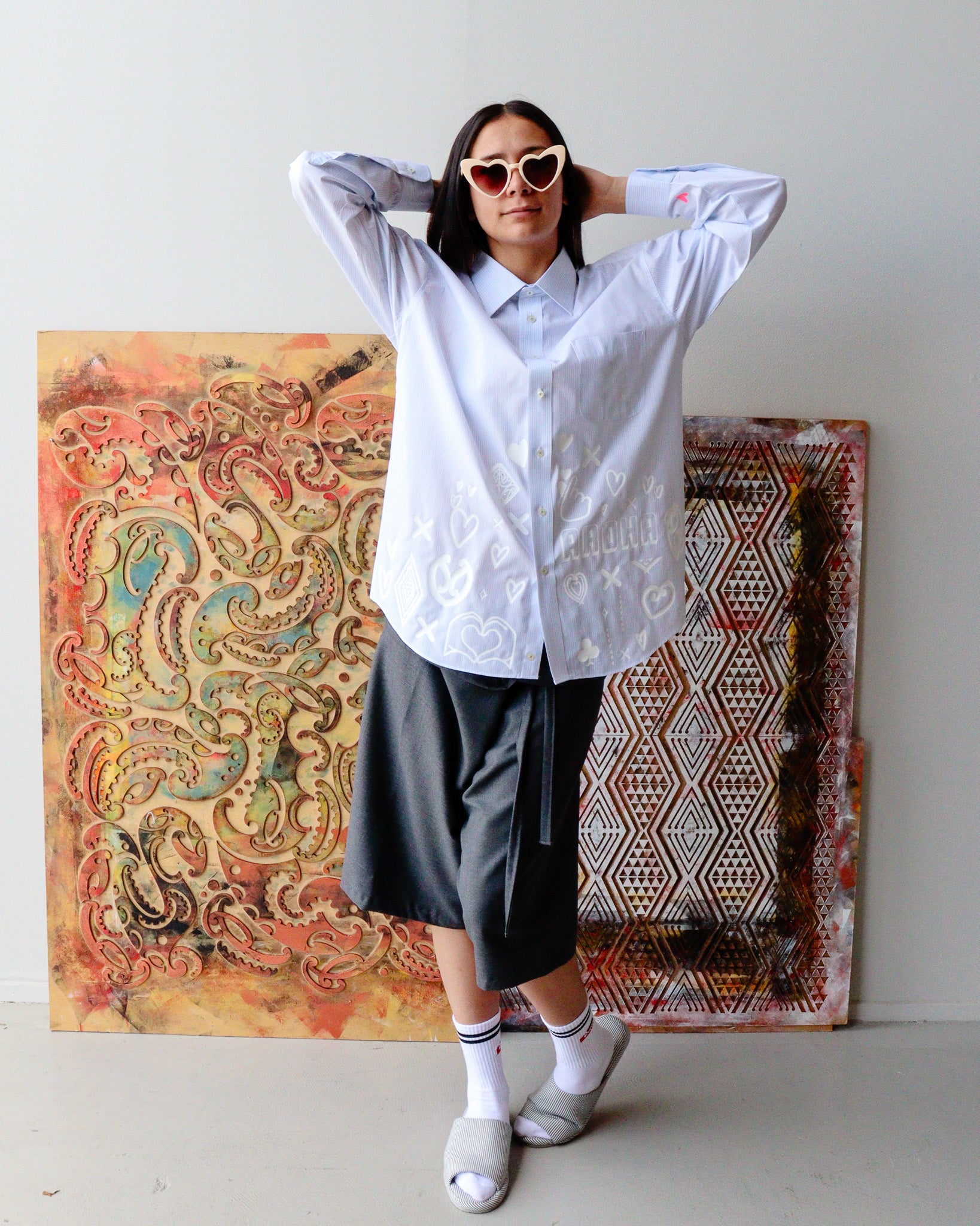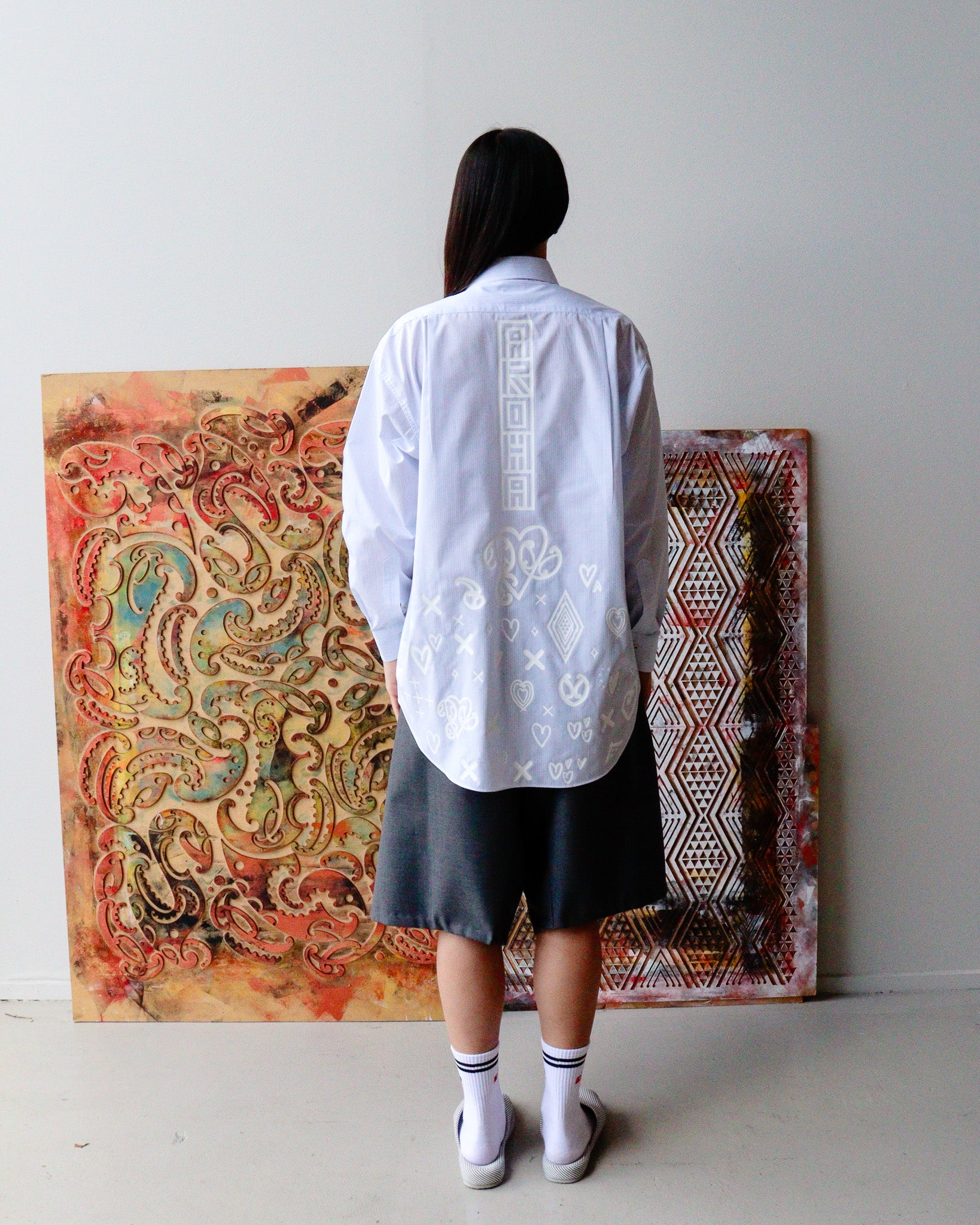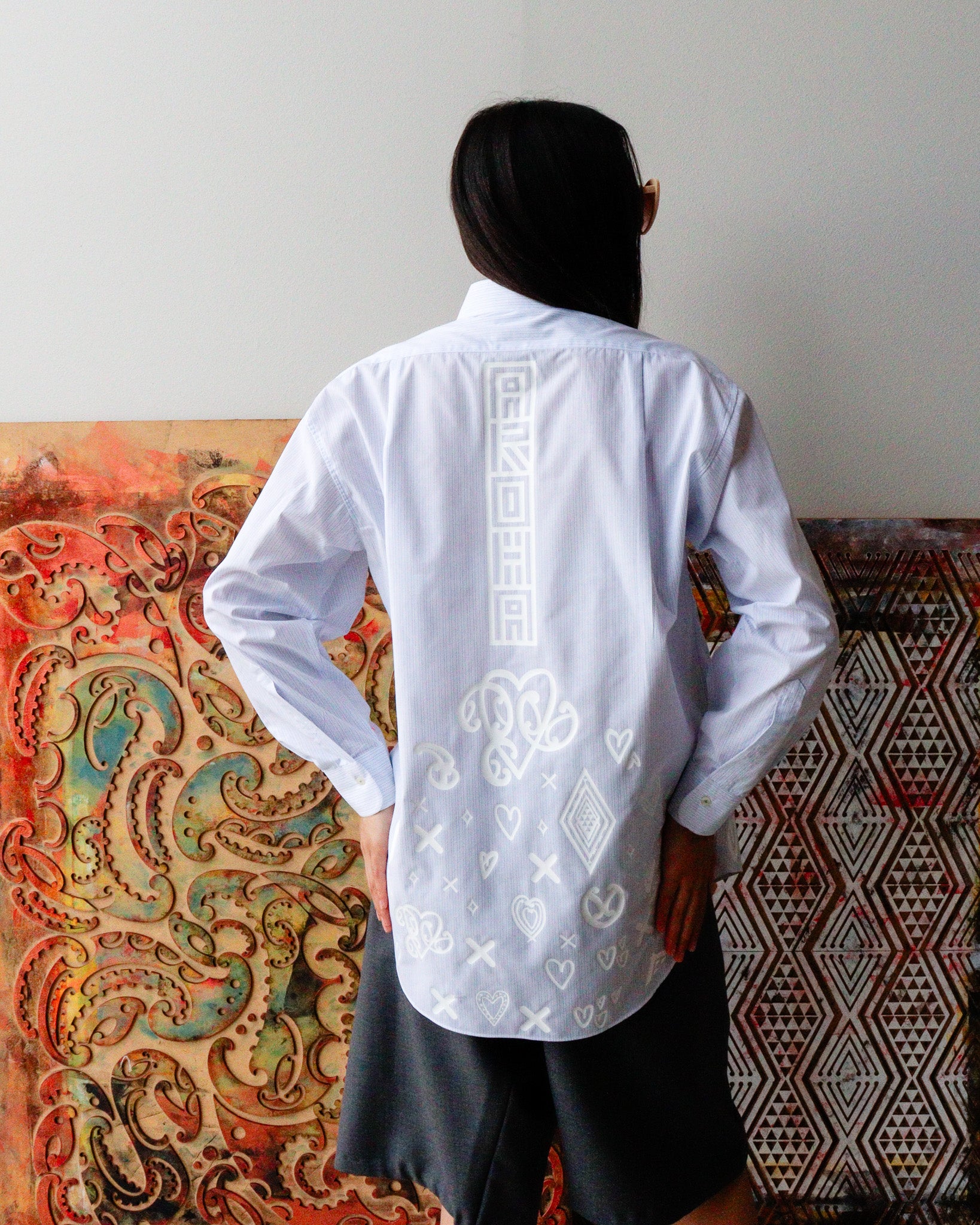 One-of-a-kind, second hand long sleeve shirt reimagined through a Māori lens and urban flair. Each piece is hand-printed and painted, telling its own indigenous narrative, no two are the same.