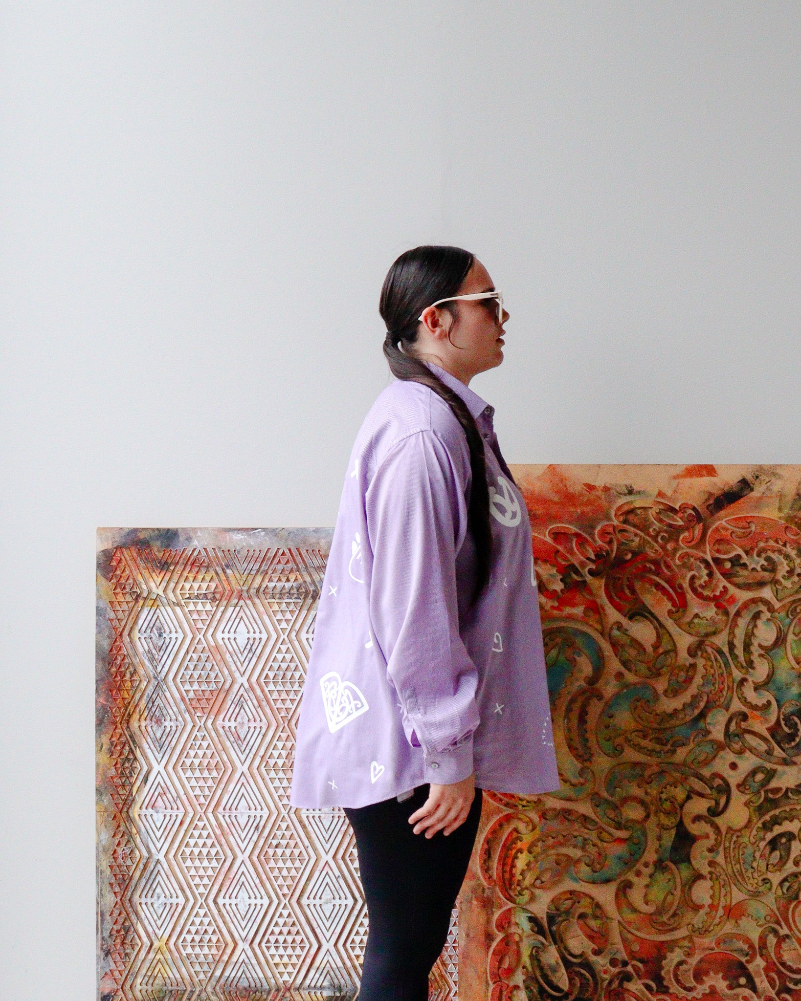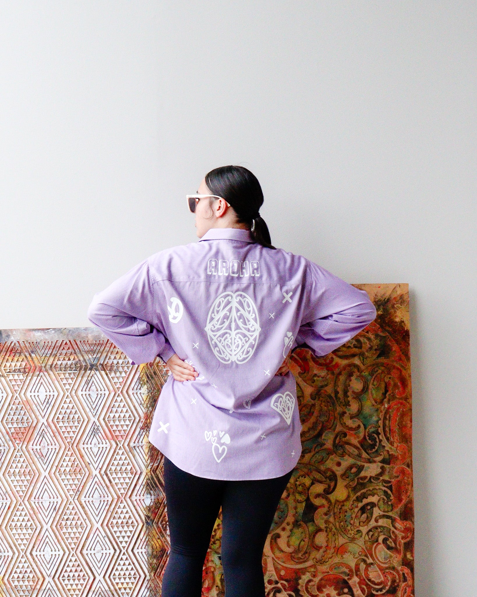One-of-a-kind, second hand long sleeve shirt reimagined through a Māori lens and urban flair. Each piece is hand-printed and painted, telling its own indigenous narrative, no two are the same.