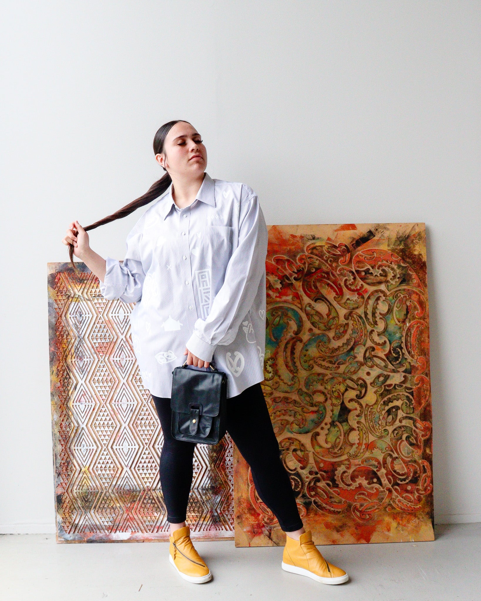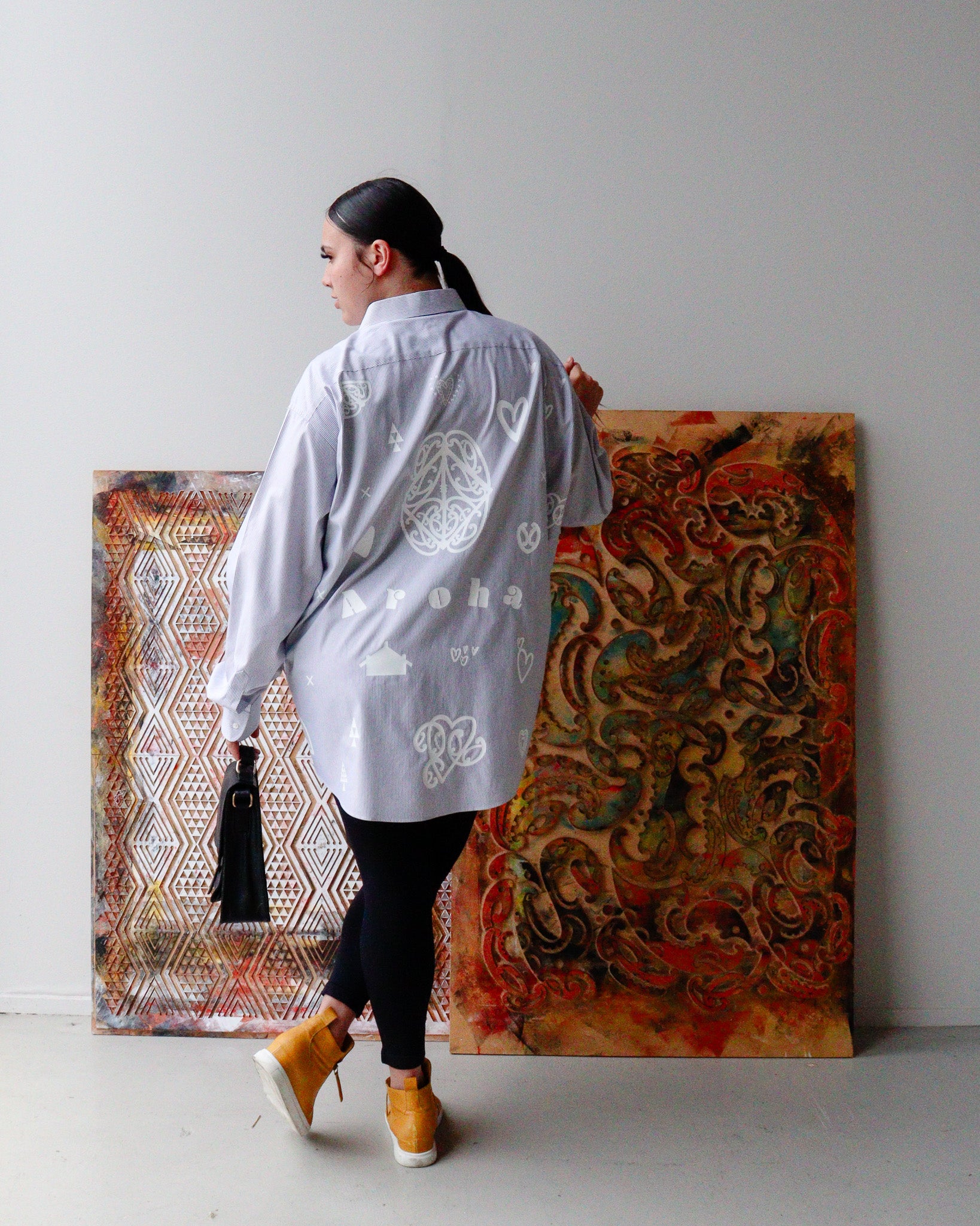 One-of-a-kind, second hand long sleeve shirt reimagined through a Māori lens and urban flair. Each piece is hand-printed and painted, telling its own indigenous narrative, no two are the same.