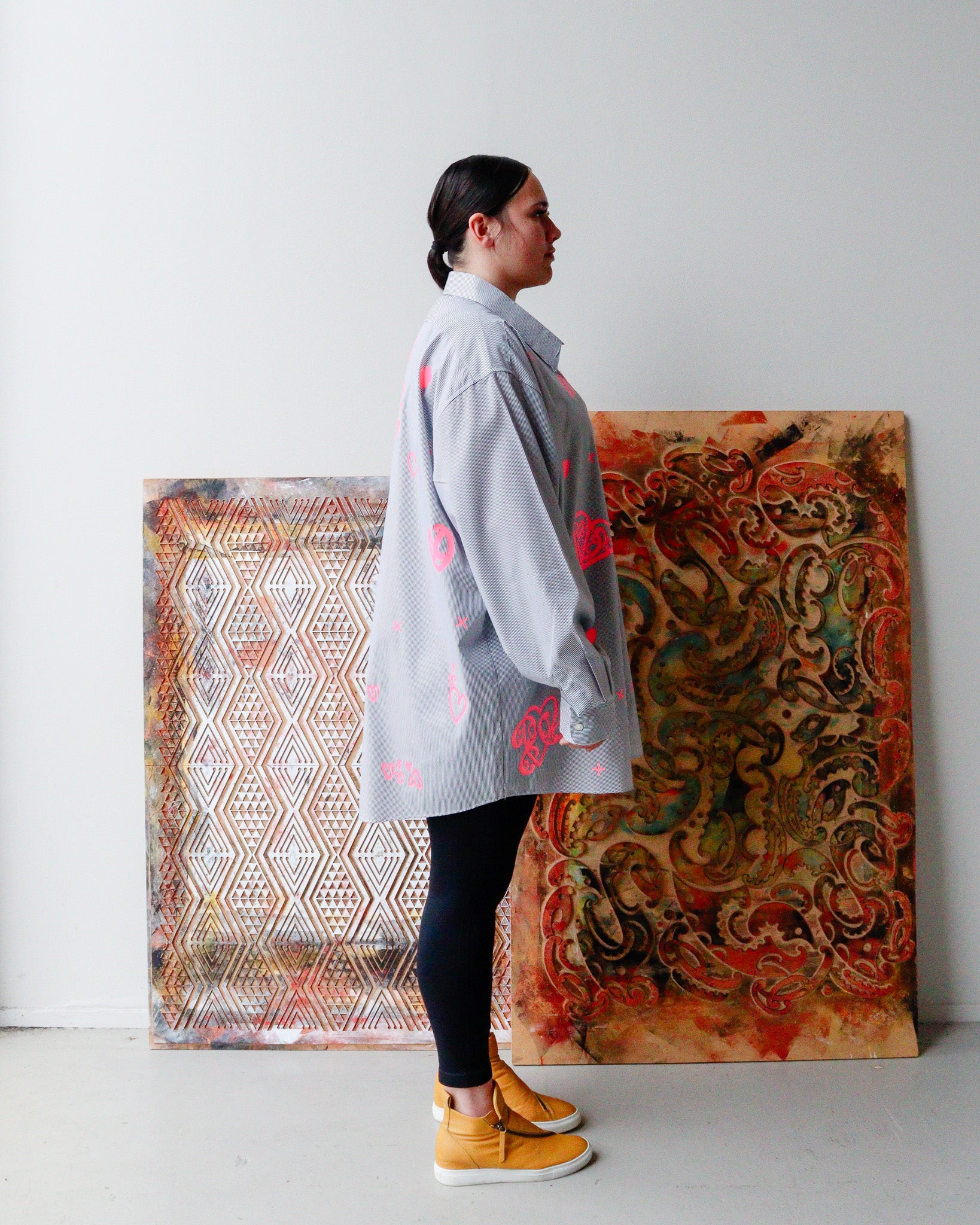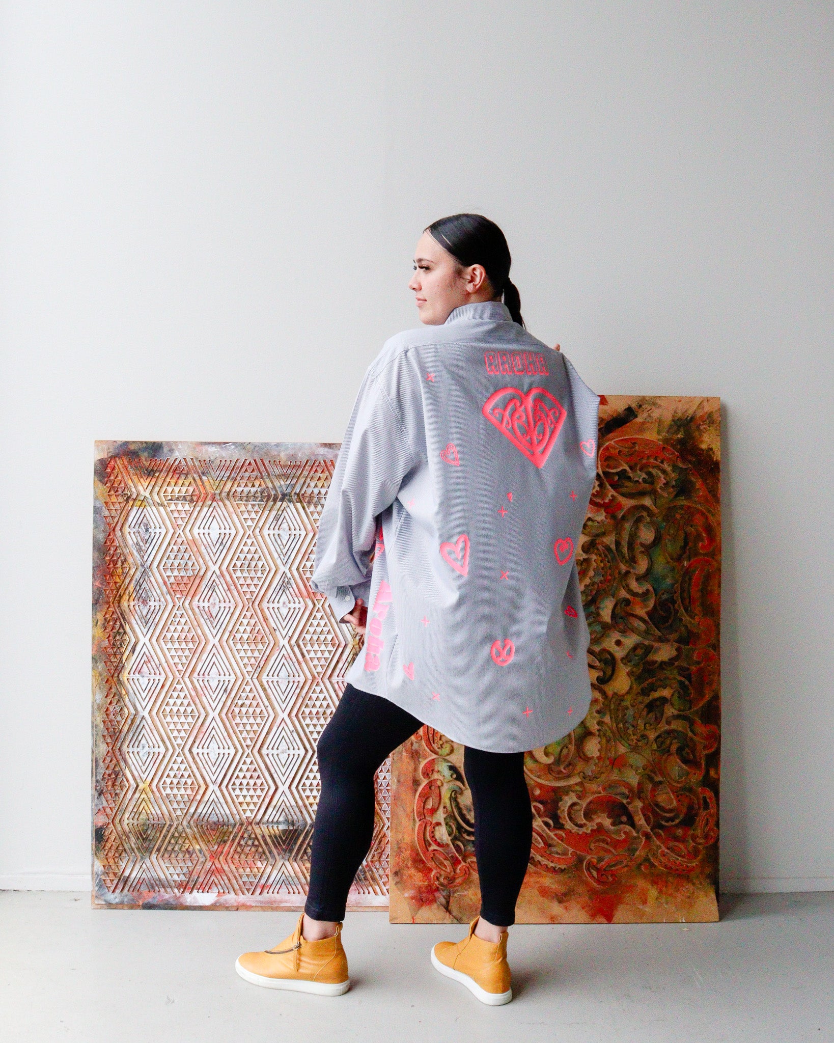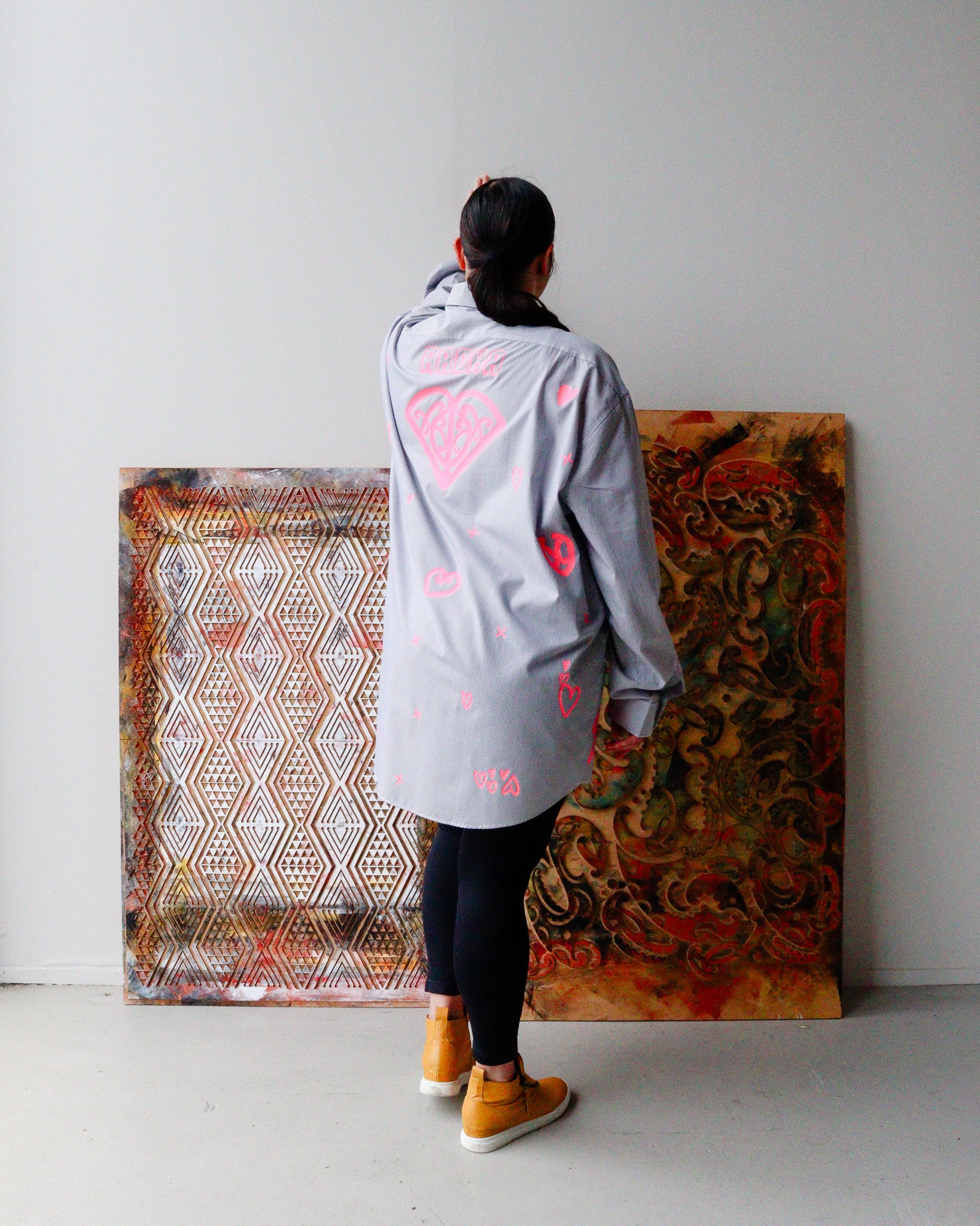 One-of-a-kind, second hand long sleeve shirt reimagined through a Māori lens and urban flair. Each piece is hand-printed and painted, telling its own indigenous narrative, no two are the same.