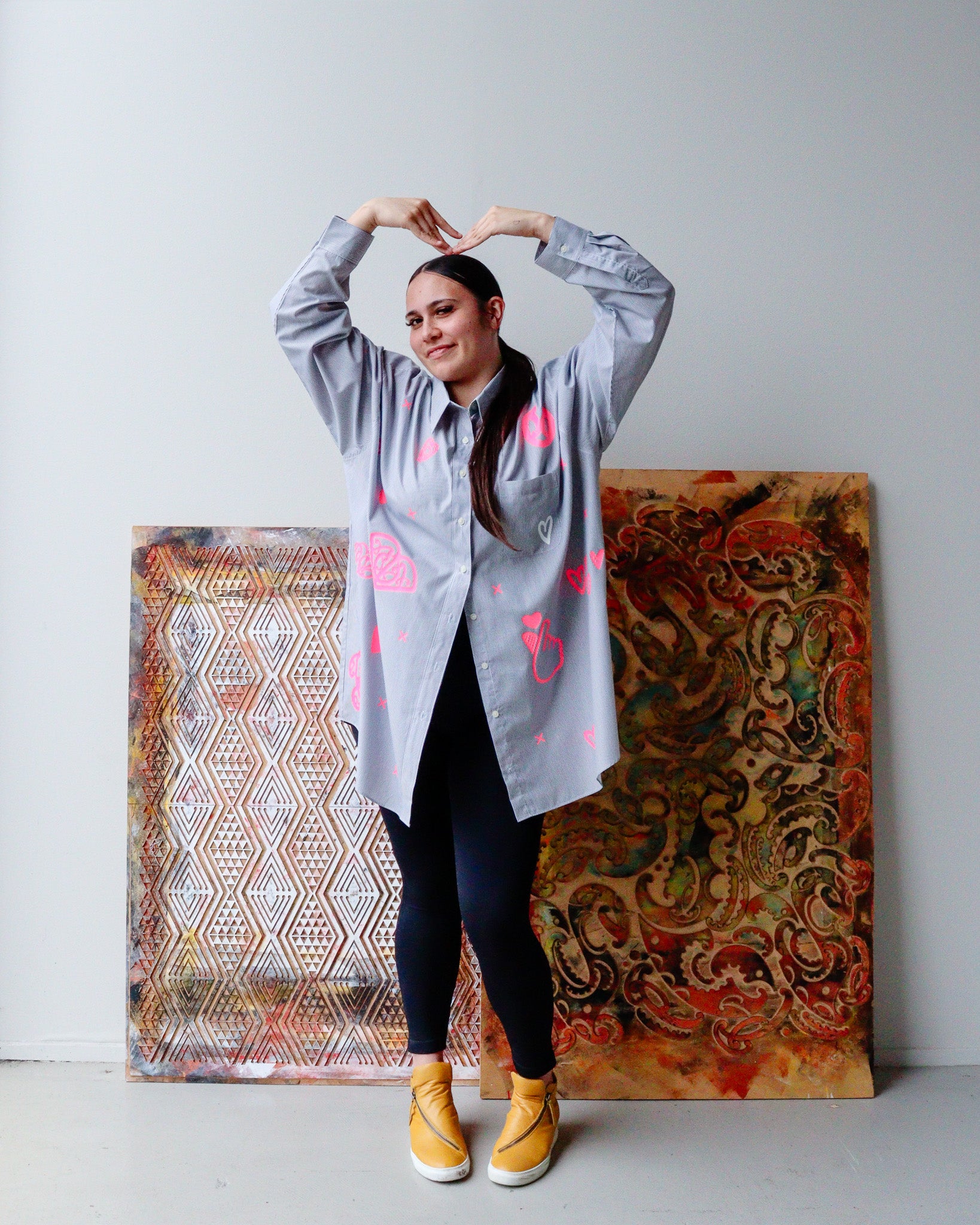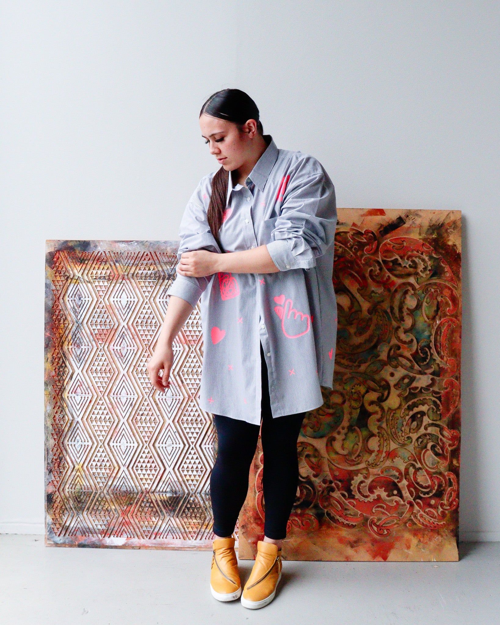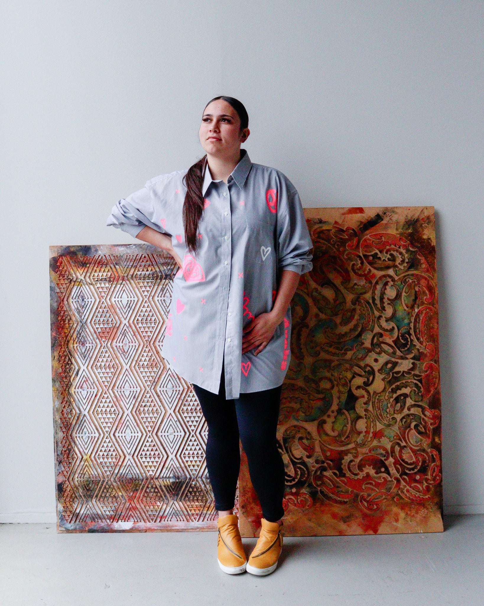 One-of-a-kind, second hand long sleeve shirt reimagined through a Māori lens and urban flair. Each piece is hand-printed and painted, telling its own indigenous narrative, no two are the same.