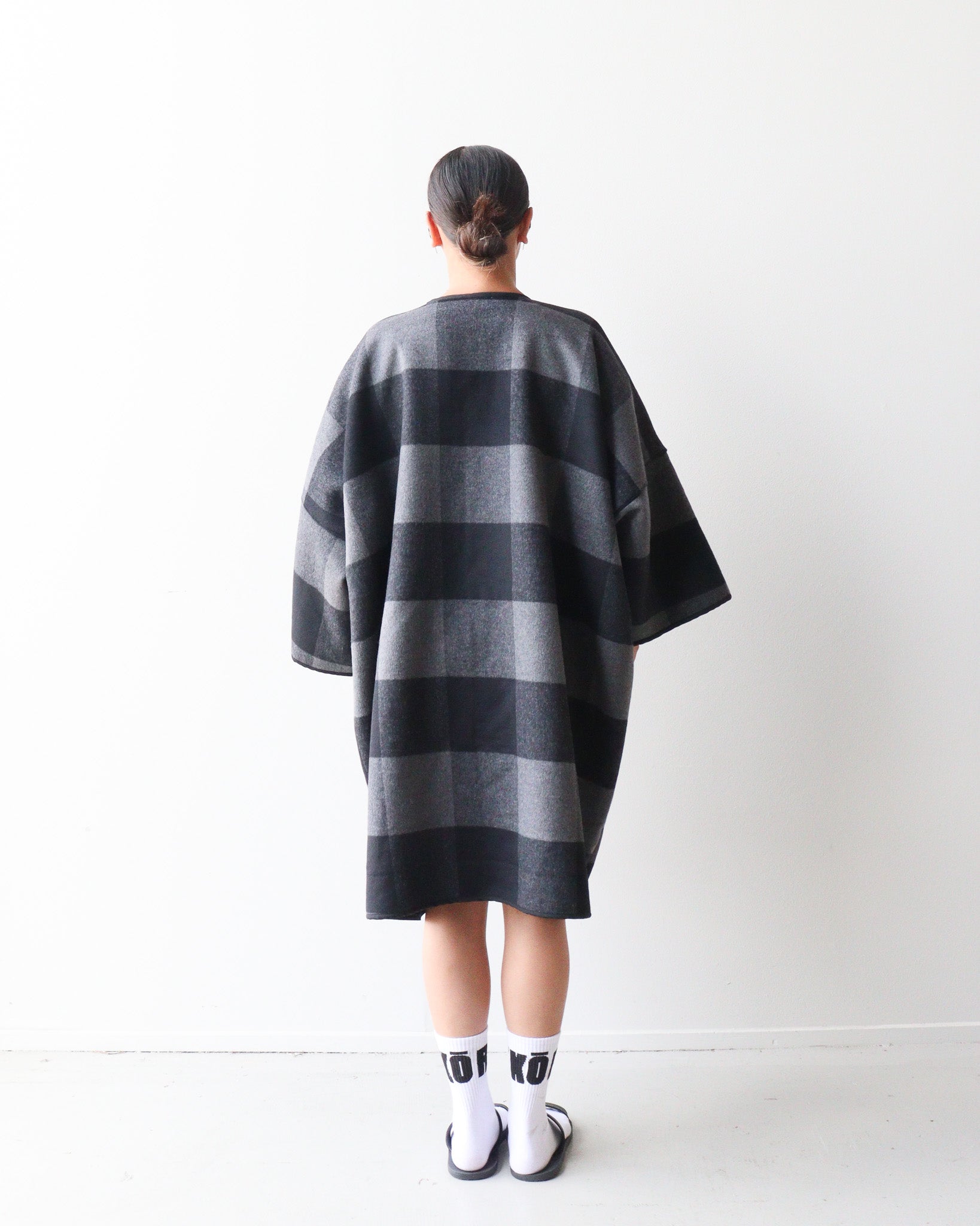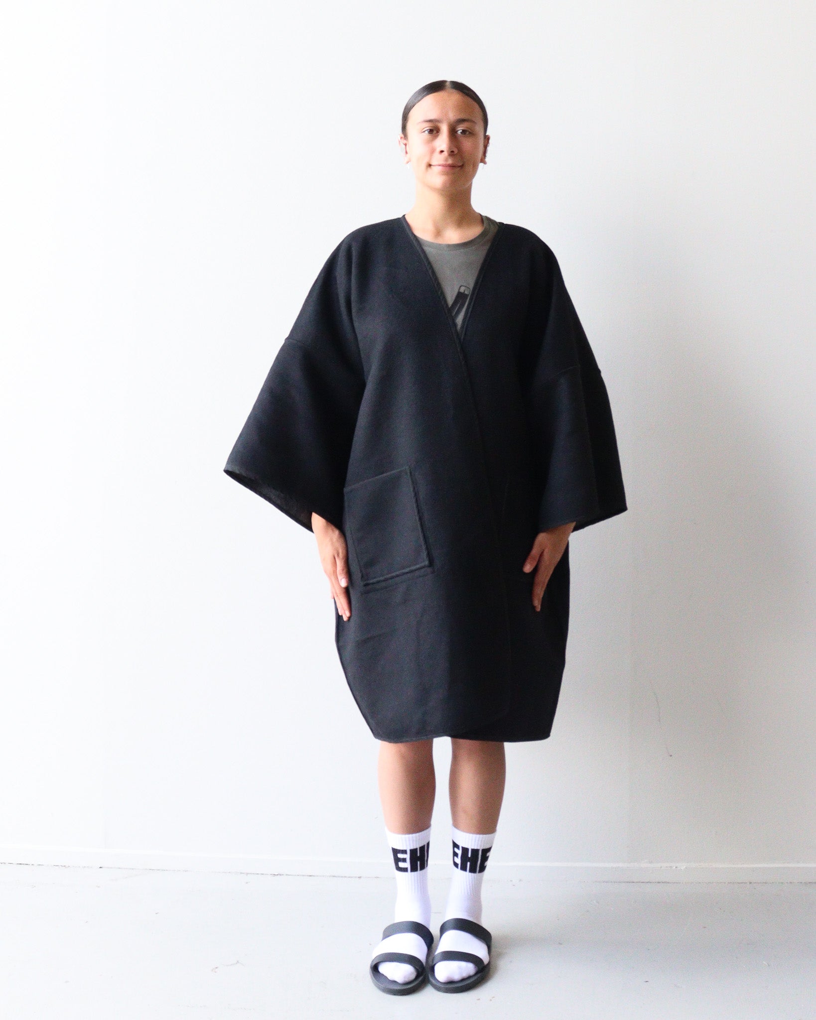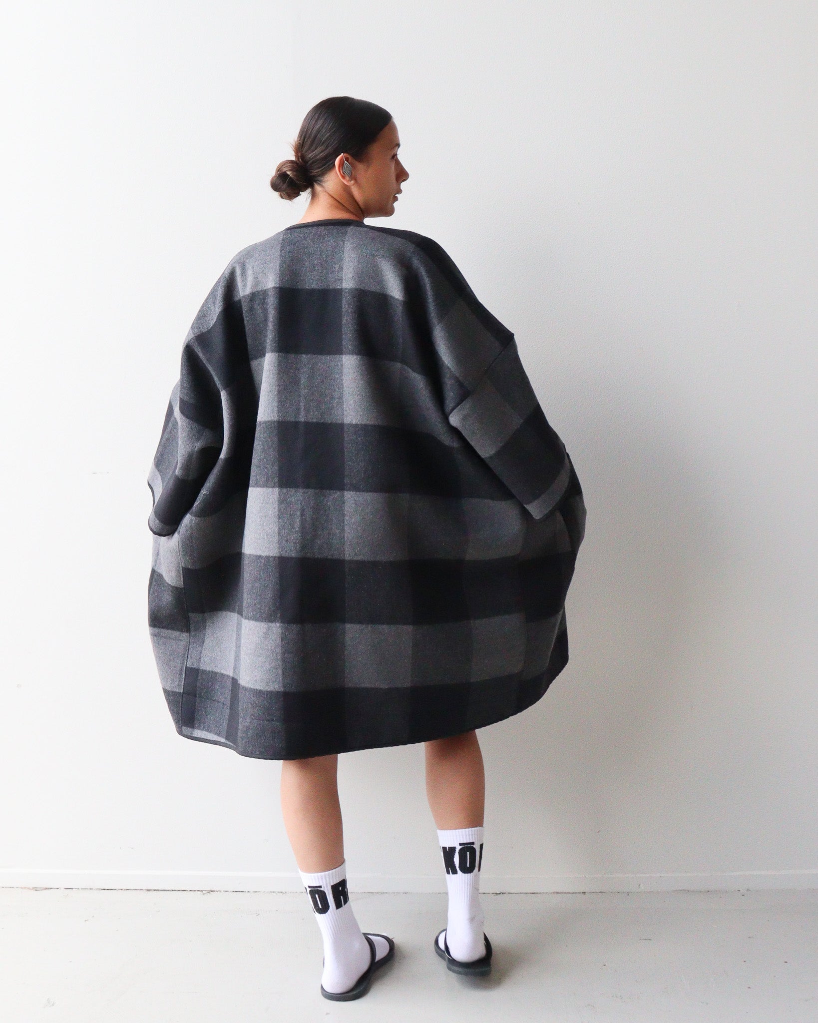Style: Created in one size fits all, this jacket is styled to be boxy and oversized. We created it to make a statement and for wearing in winter with layers underneath. NOTE: it is not lined and comes with a brooch to hold it together.