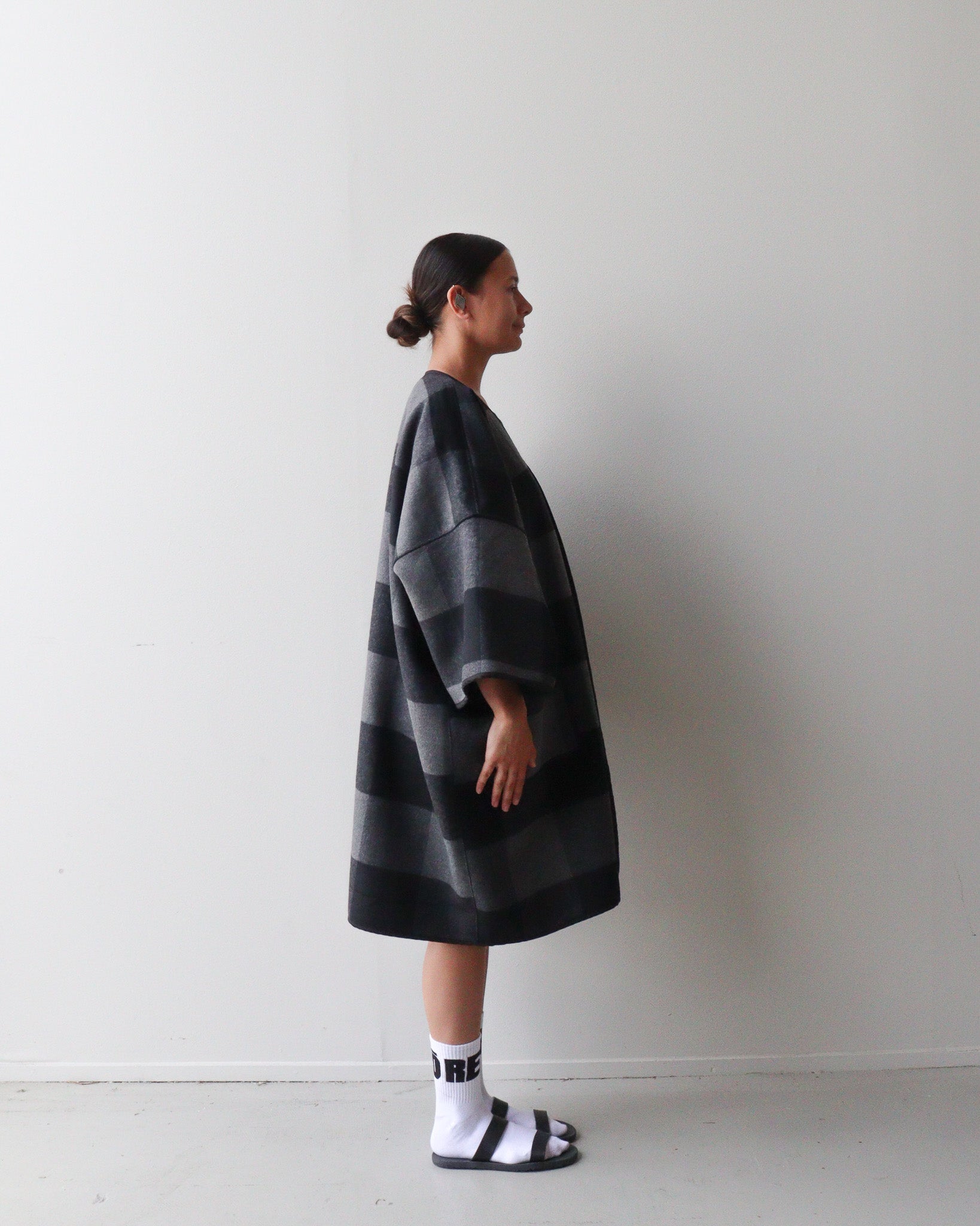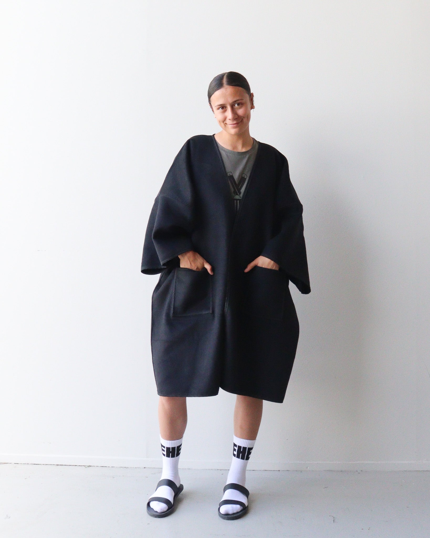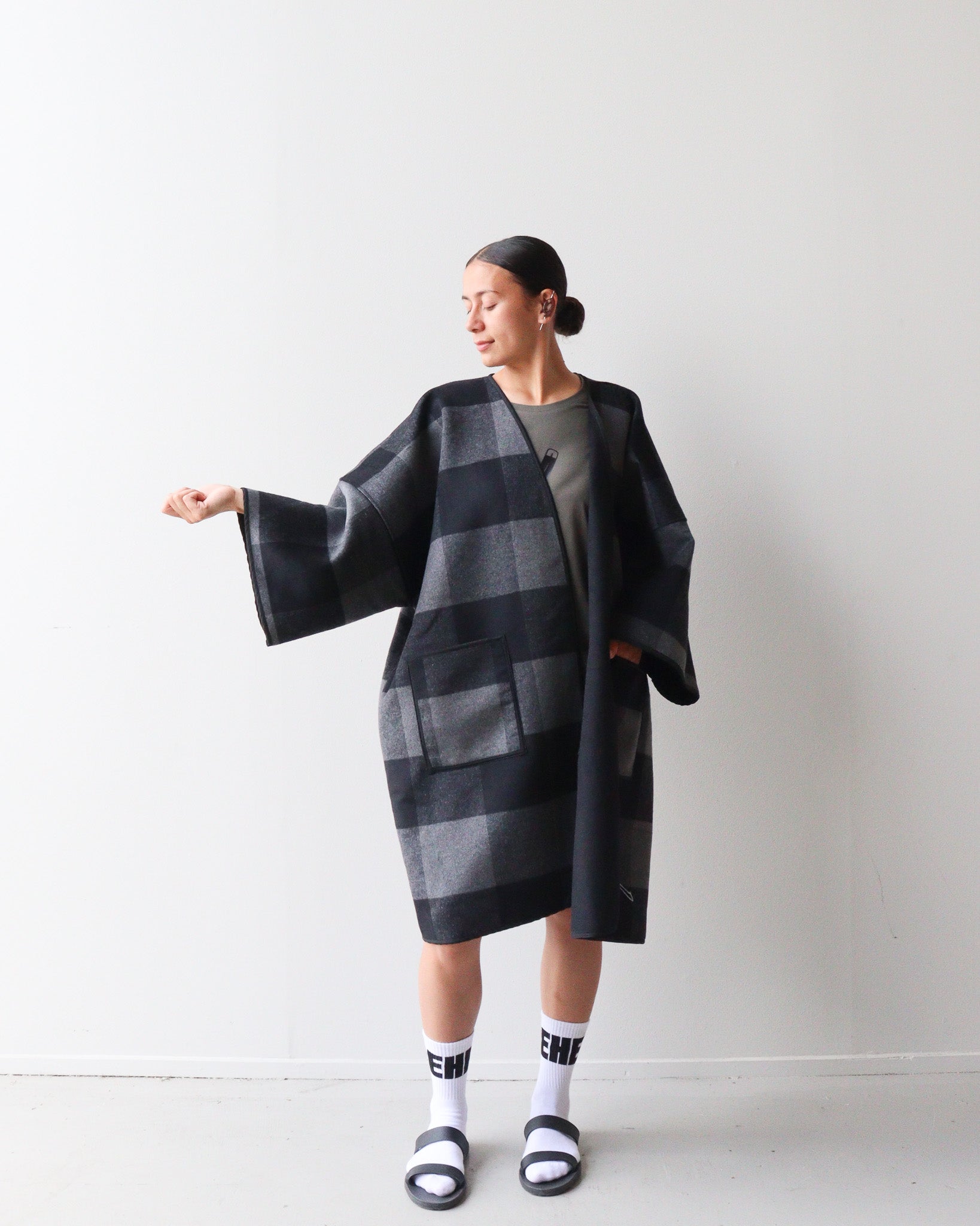 Style: Created in one size fits all, this jacket is styled to be boxy and oversized. We created it to make a statement and for wearing in winter with layers underneath. NOTE: it is not lined and comes with a brooch to hold it together.