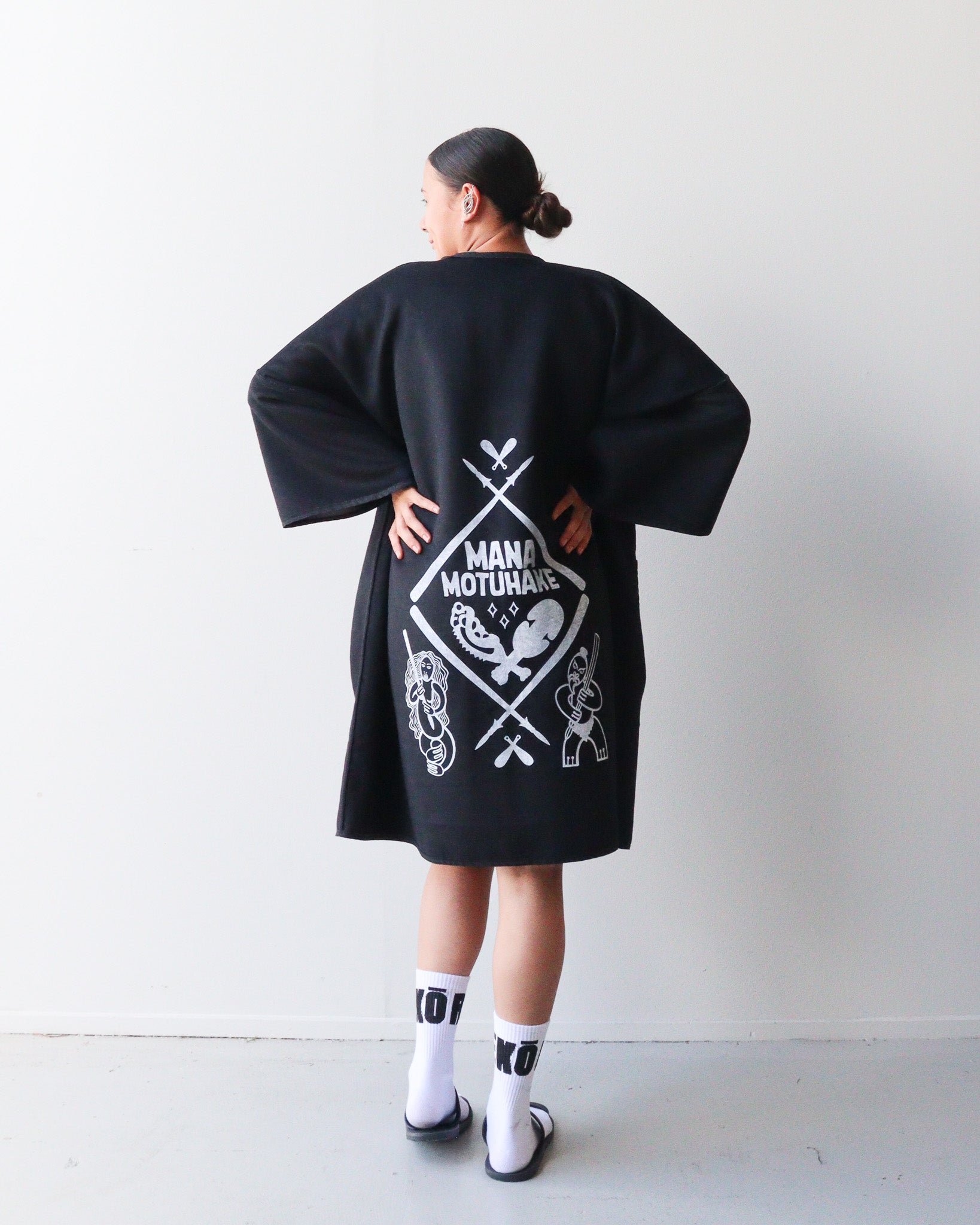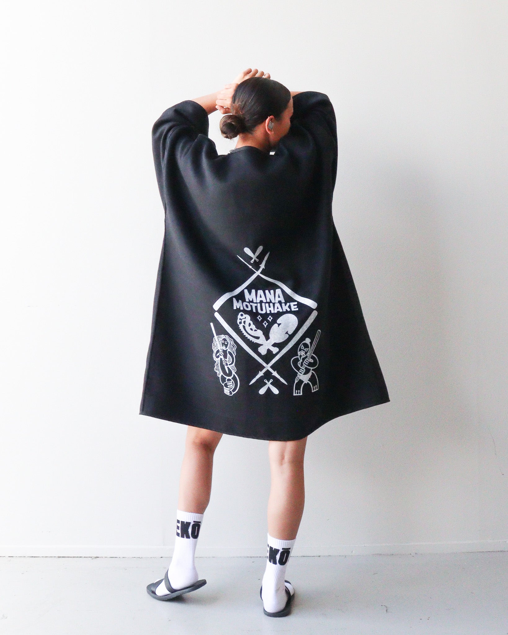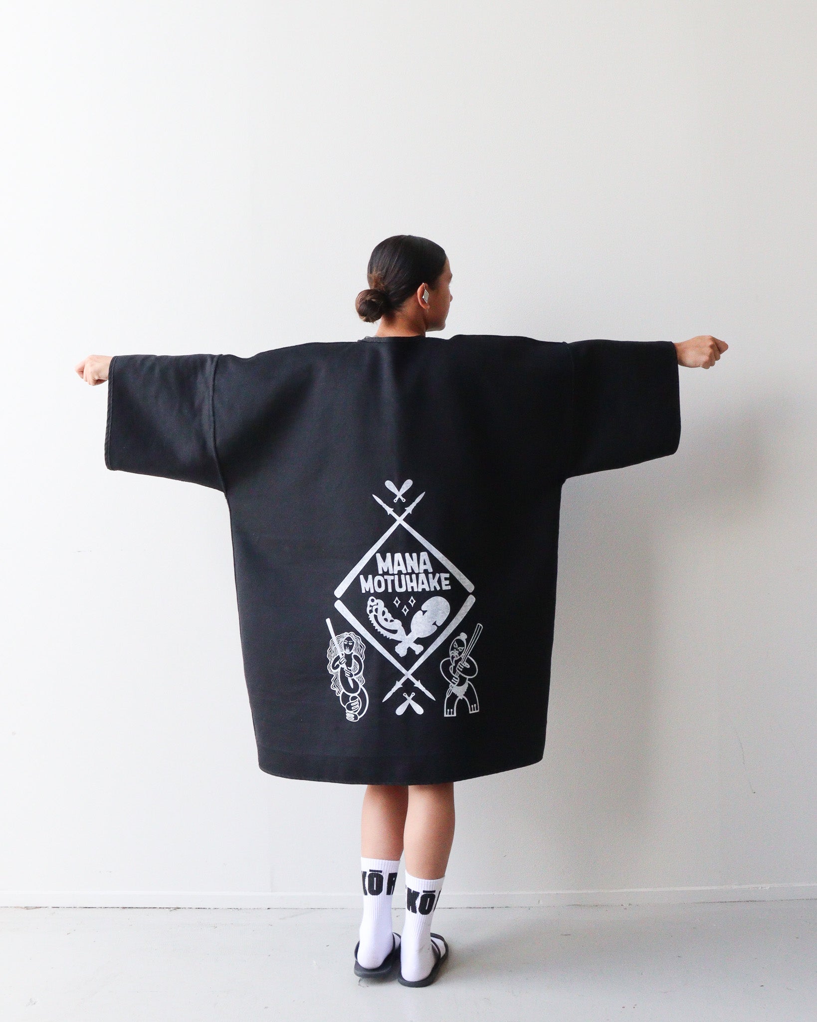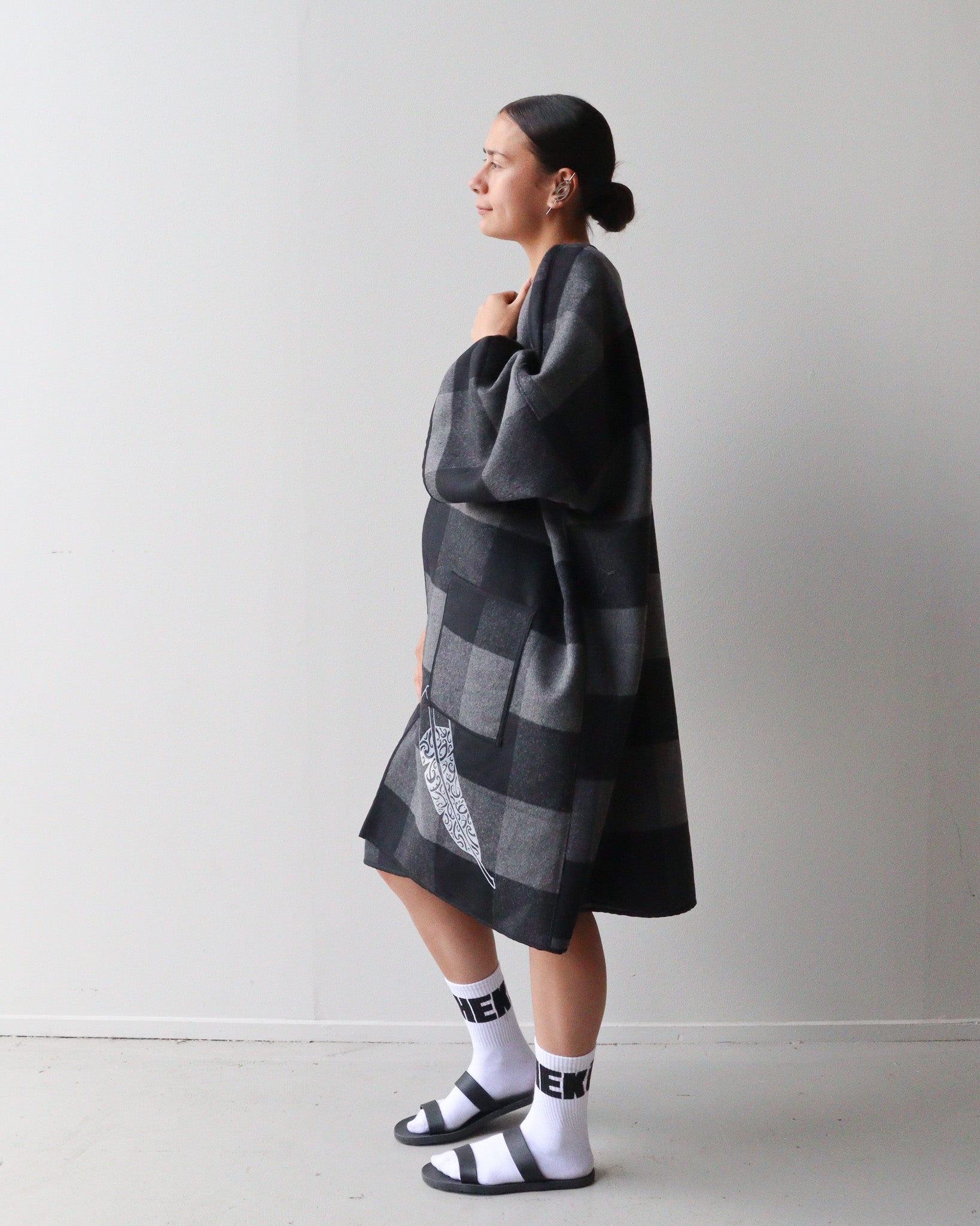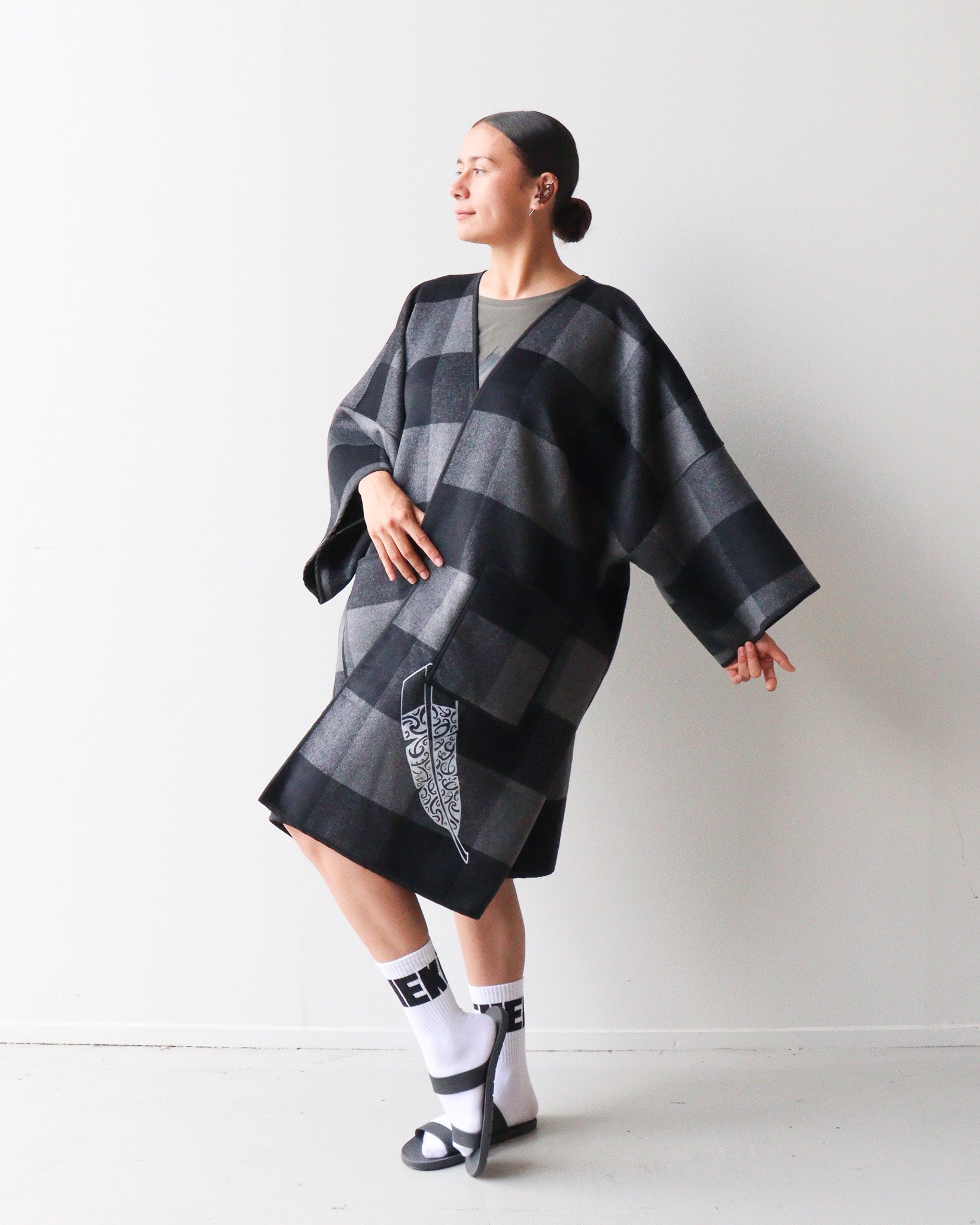 Design Prints: Mana Motuhake: This print design reflects mana motuhake, the strength to stand tall, to uphold ancestral knowledge, and to move forward on our own terms. To do this we have used white paint on the black side with our new Mana Motuhake print, then on the grey and black check side we have use our raukura print.