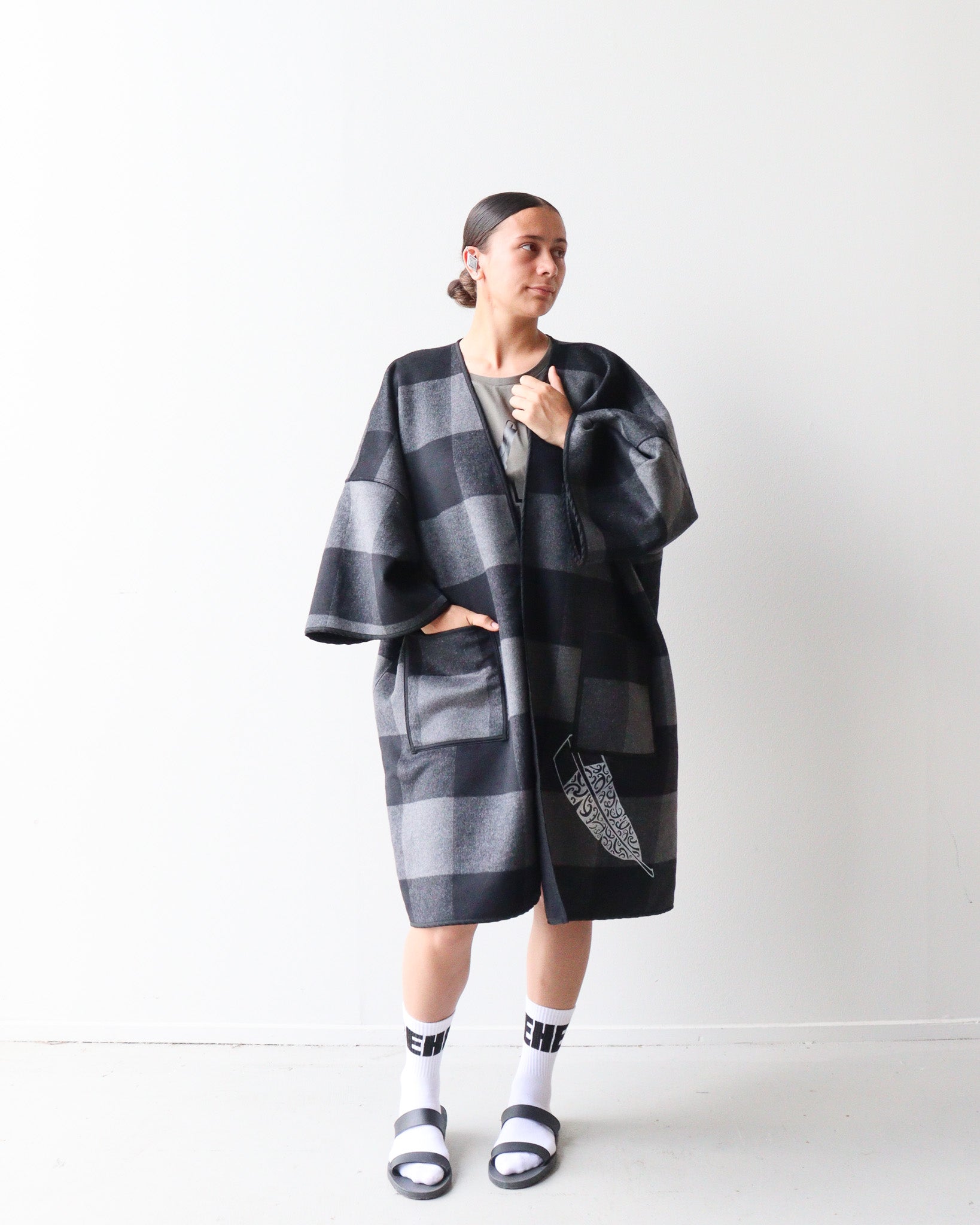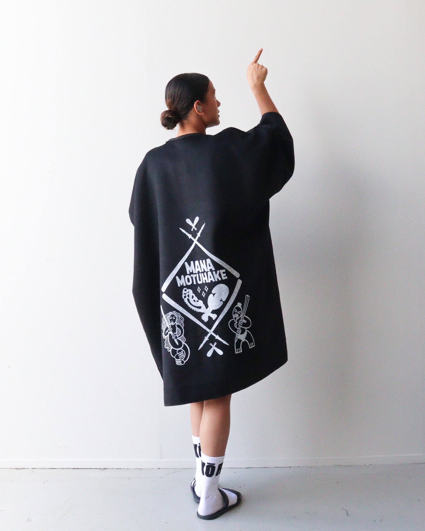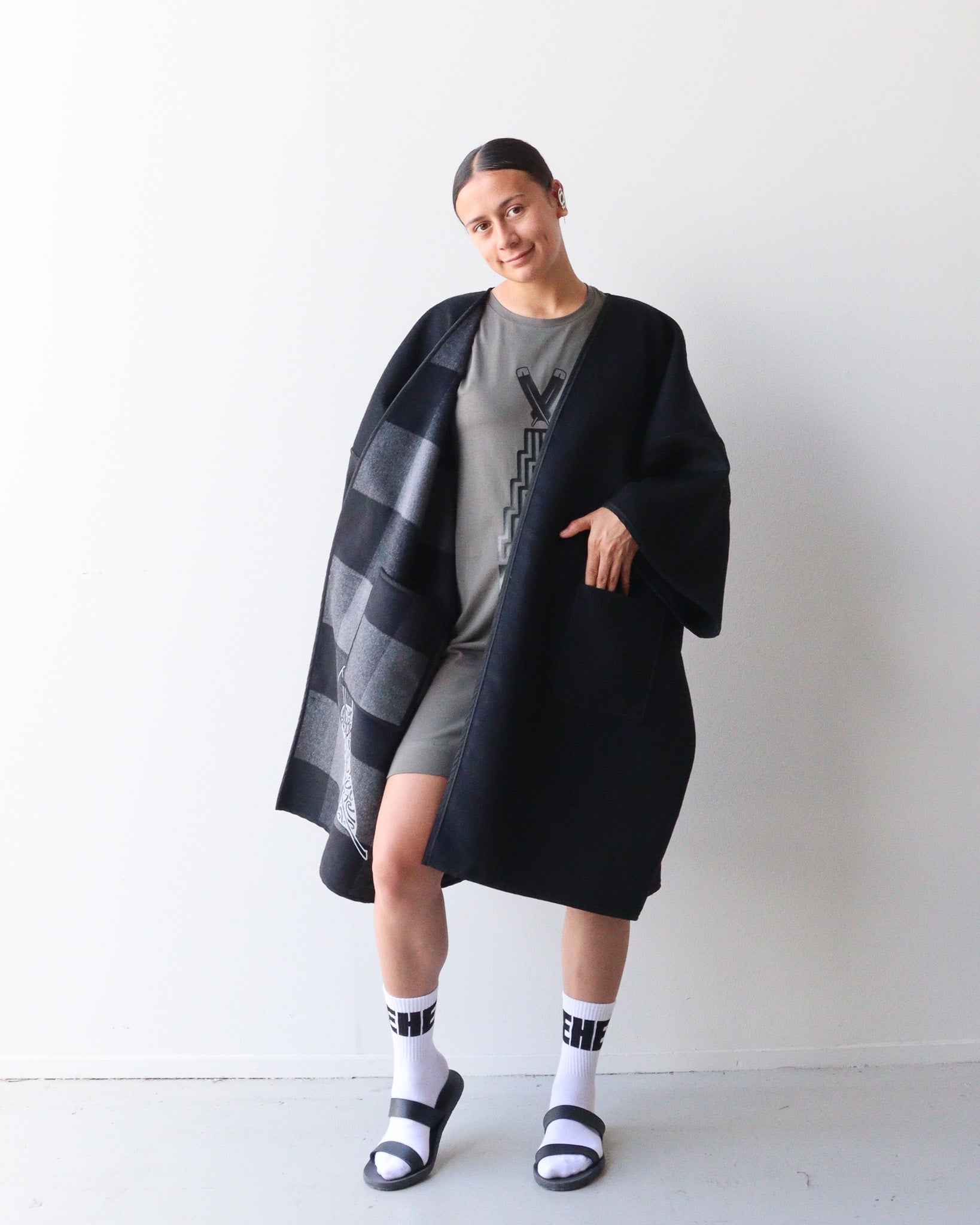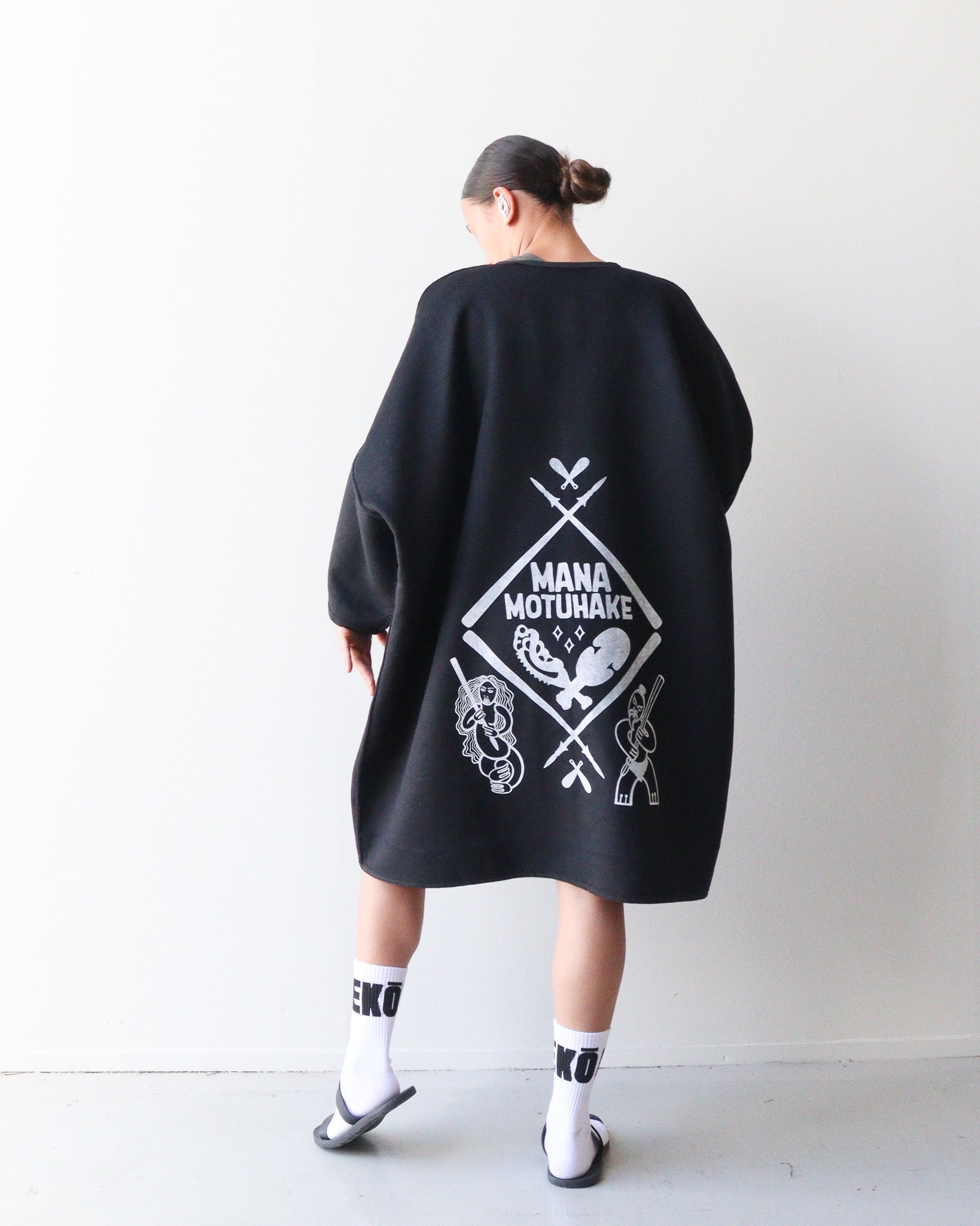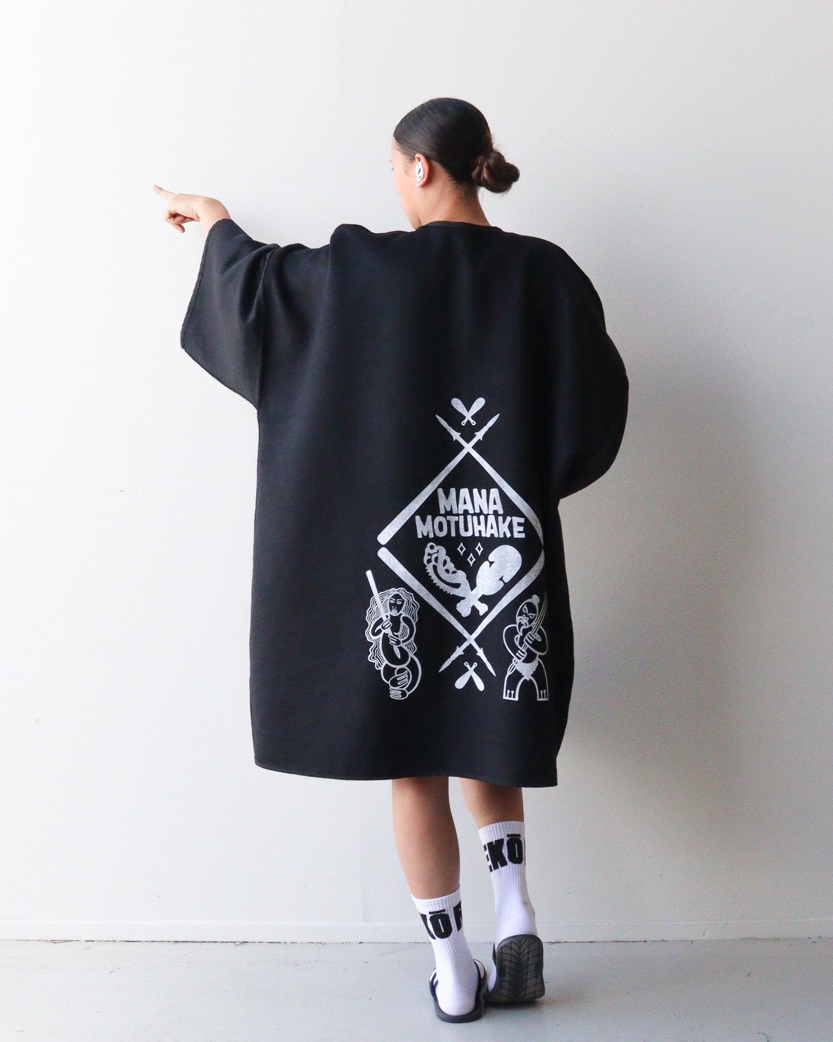 Design Prints: Mana Motuhake: This print design reflects mana motuhake, the strength to stand tall, to uphold ancestral knowledge, and to move forward on our own terms. To do this we have used white paint on the black side with our new Mana Motuhake print, then on the grey and black check side we have use our raukura print.